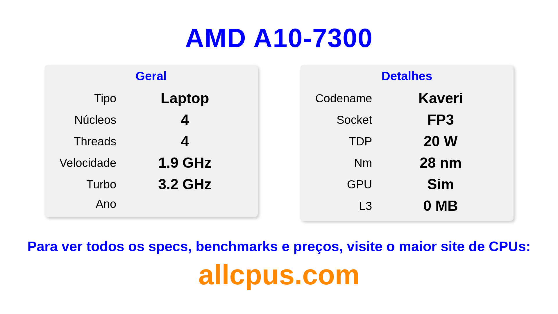 O AMD A10-7300 é um AMD processador de notebook da linha A-Series, baseado na arquitetura Kaveri e lançado em . Este CPU possui 4 núcleos, clock base de 1900 MHz, frequência turbo máxima de 3200 MHz e 0 MB de cache L3. Fabricado usando tecnologia de processo de 28 nm.O AMD A10-7300 é projetado para o socket FP3. Inclui gráficos integrados AMD Radeon R6 Graphics.