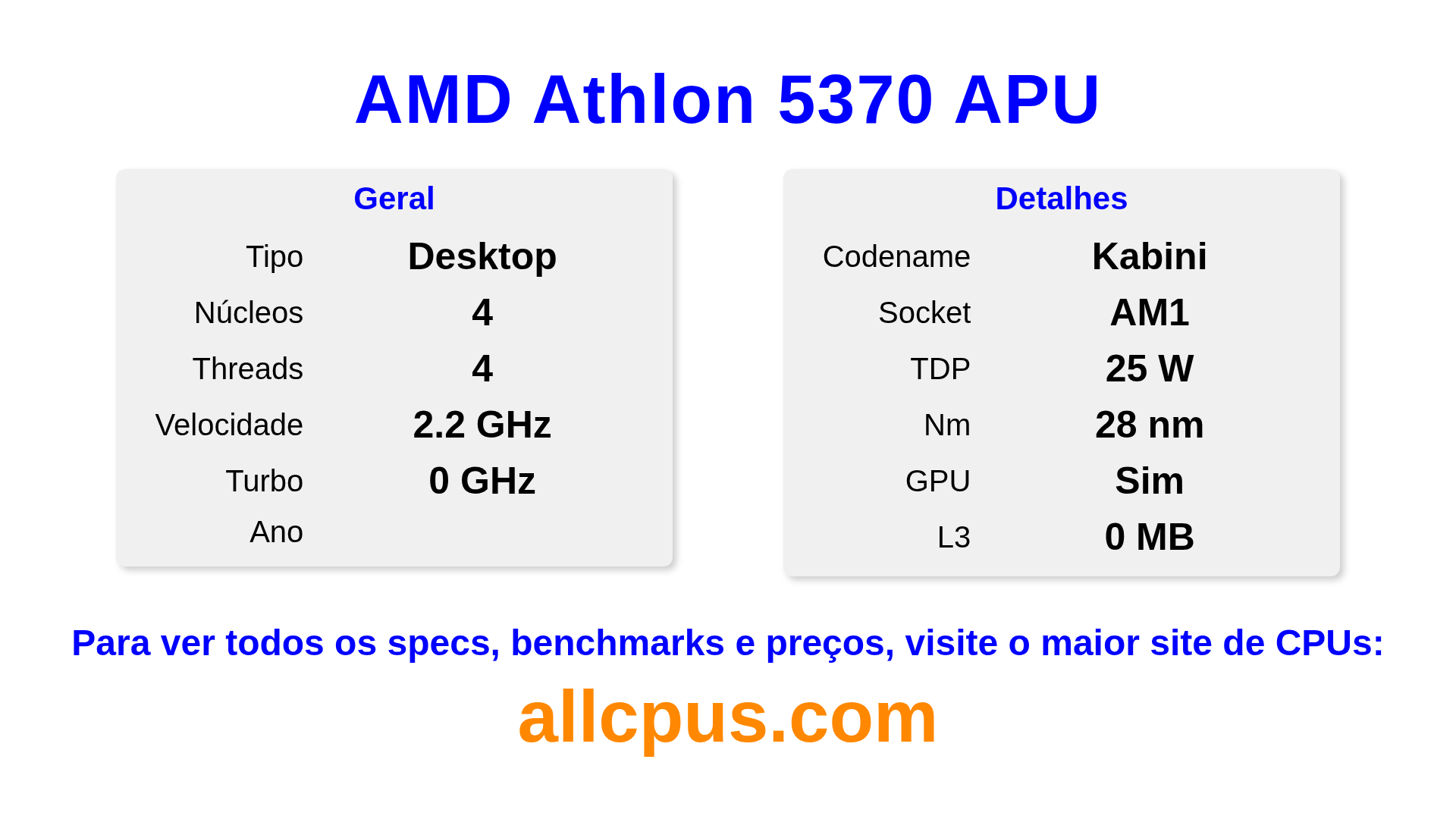 O AMD Athlon 5370 APU é um AMD processador de desktop da linha Athlon, baseado na arquitetura Kabini e lançado em . Este CPU possui 4 núcleos, clock base de 2200 MHz, frequência turbo máxima de 0 MHz e 0 MB de cache L3. Fabricado usando tecnologia de processo de 28 nm.O AMD Athlon 5370 APU é projetado para o socket AM1. Inclui gráficos integrados AMD Radeon R3 Graphics.