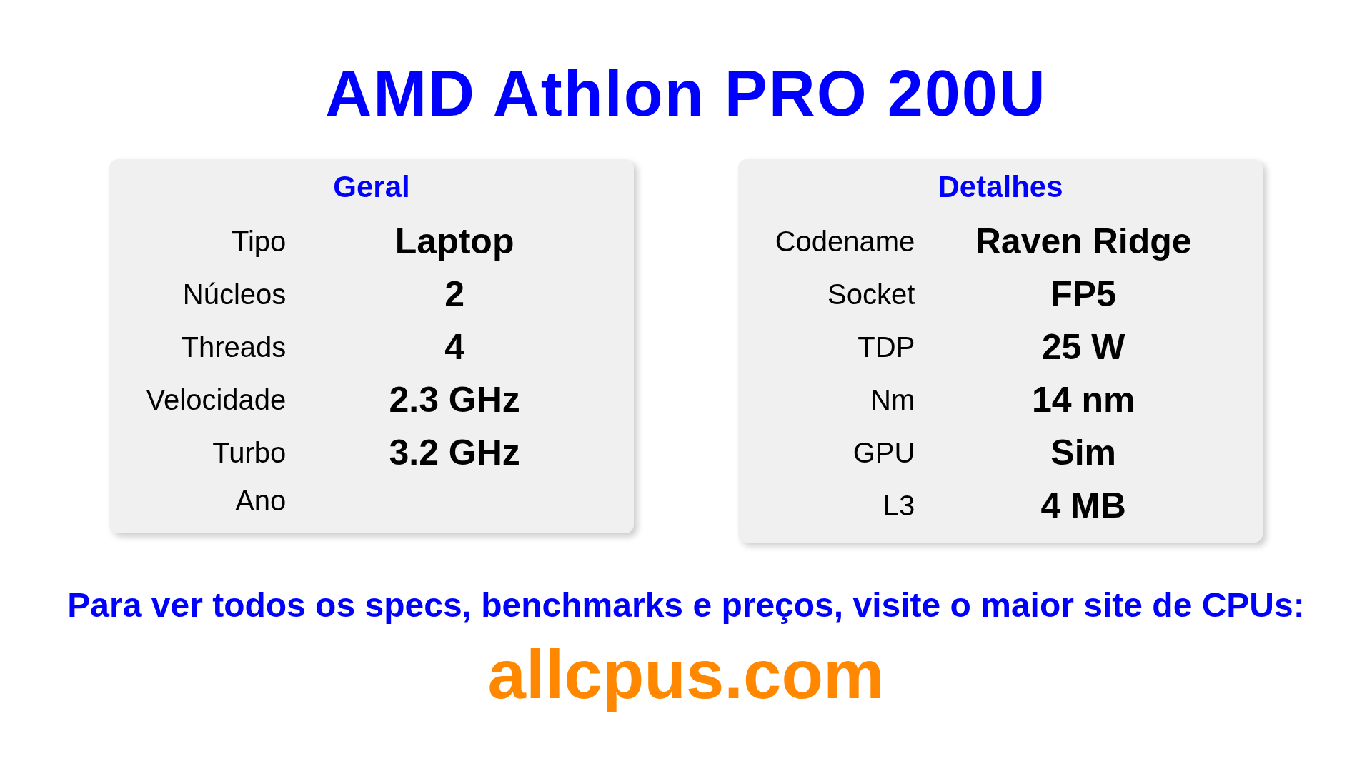 O AMD Athlon PRO 200U é um AMD processador de notebook da linha Athlon PRO, baseado na arquitetura Raven Ridge e lançado em . Este CPU possui 2 núcleos, clock base de 2300 MHz, frequência turbo máxima de 3200 MHz e 4 MB de cache L3. Fabricado usando tecnologia de processo de 14 nm.O AMD Athlon PRO 200U é projetado para o socket FP5. Inclui gráficos integrados Radeon Vega 3 Graphics.