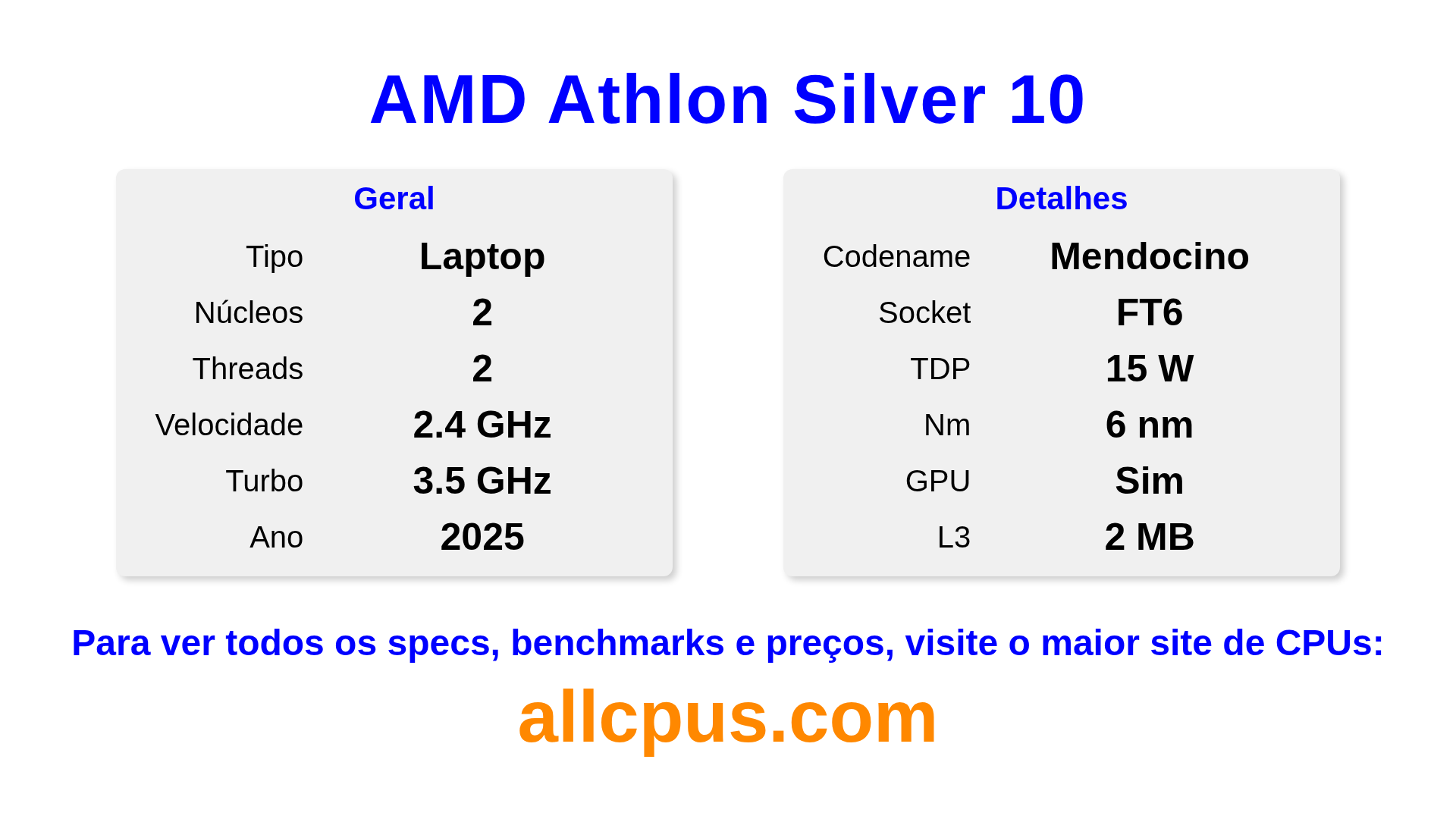 O AMD Athlon Silver 10 é um AMD processador de notebook da linha Athlon, baseado na arquitetura Mendocino e lançado em 2025. Este CPU possui 2 núcleos, clock base de 2400 MHz, frequência turbo máxima de 3500 MHz e 2 MB de cache L3. Fabricado usando tecnologia de processo de 6 nm.O AMD Athlon Silver 10 é projetado para o socket FT6. Inclui gráficos integrados AMD Radeon 610M.