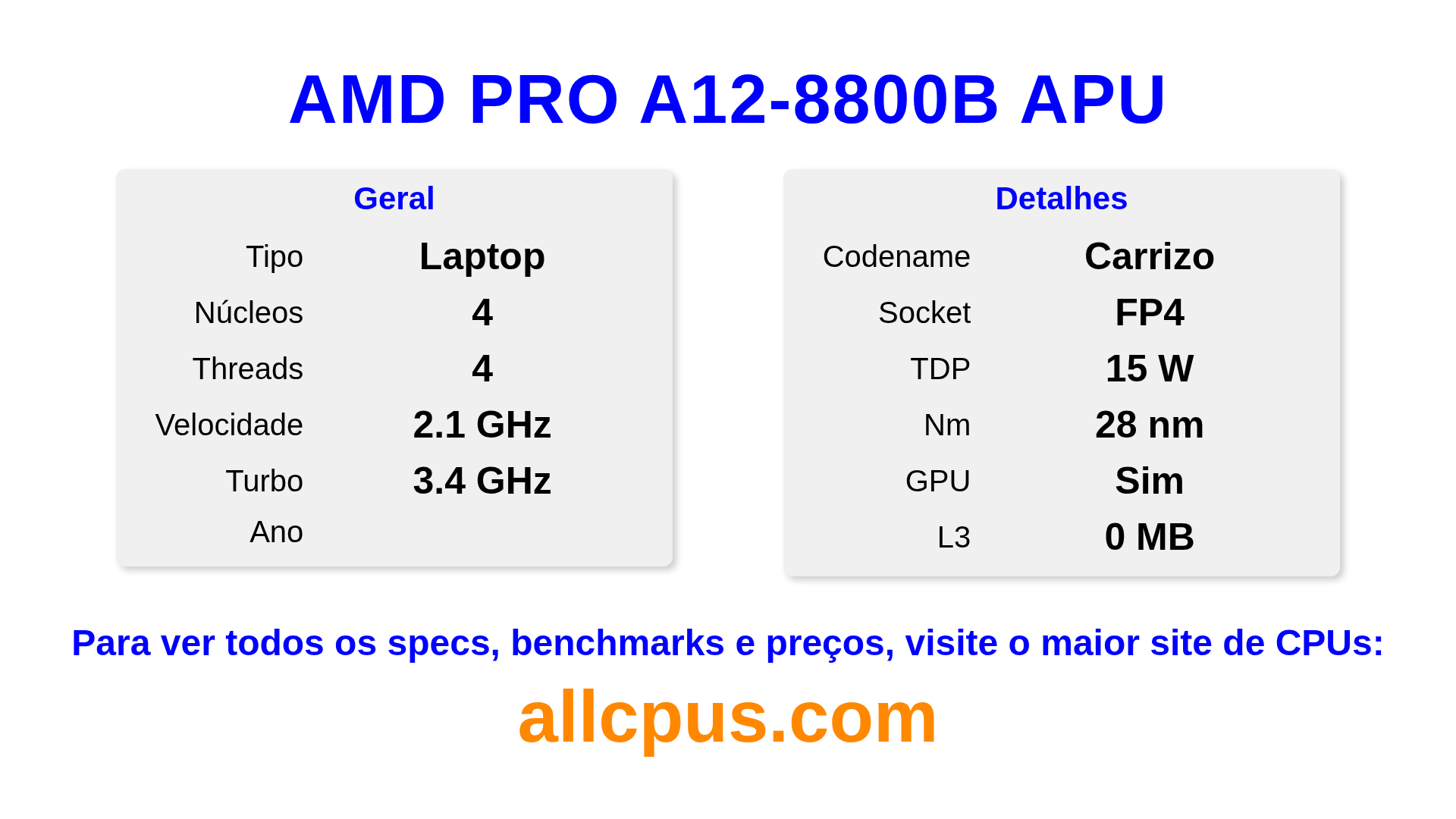O AMD PRO A12-8800B APU é um AMD processador de notebook da linha PRO A-Series, baseado na arquitetura Carrizo e lançado em . Este CPU possui 4 núcleos, clock base de 2100 MHz, frequência turbo máxima de 3400 MHz e 0 MB de cache L3. Fabricado usando tecnologia de processo de 28 nm.O AMD PRO A12-8800B APU é projetado para o socket FP4. Inclui gráficos integrados AMD Radeon R7 Graphics.