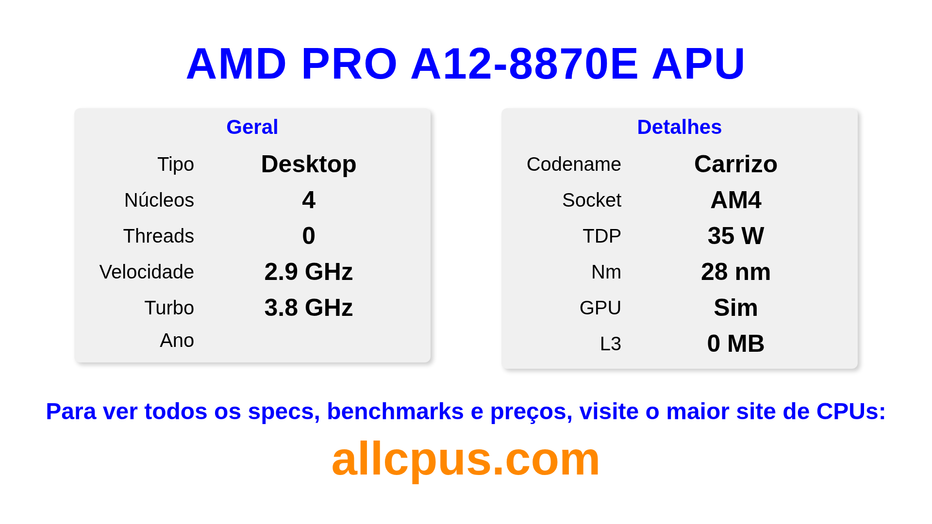O AMD PRO A12-8870E APU é um AMD processador de desktop da linha PRO A-Series, baseado na arquitetura Carrizo e lançado em . Este CPU possui 4 núcleos, clock base de 2900 MHz, frequência turbo máxima de 3800 MHz e 0 MB de cache L3. Fabricado usando tecnologia de processo de 28 nm.O AMD PRO A12-8870E APU é projetado para o socket AM4. Inclui gráficos integrados R7.