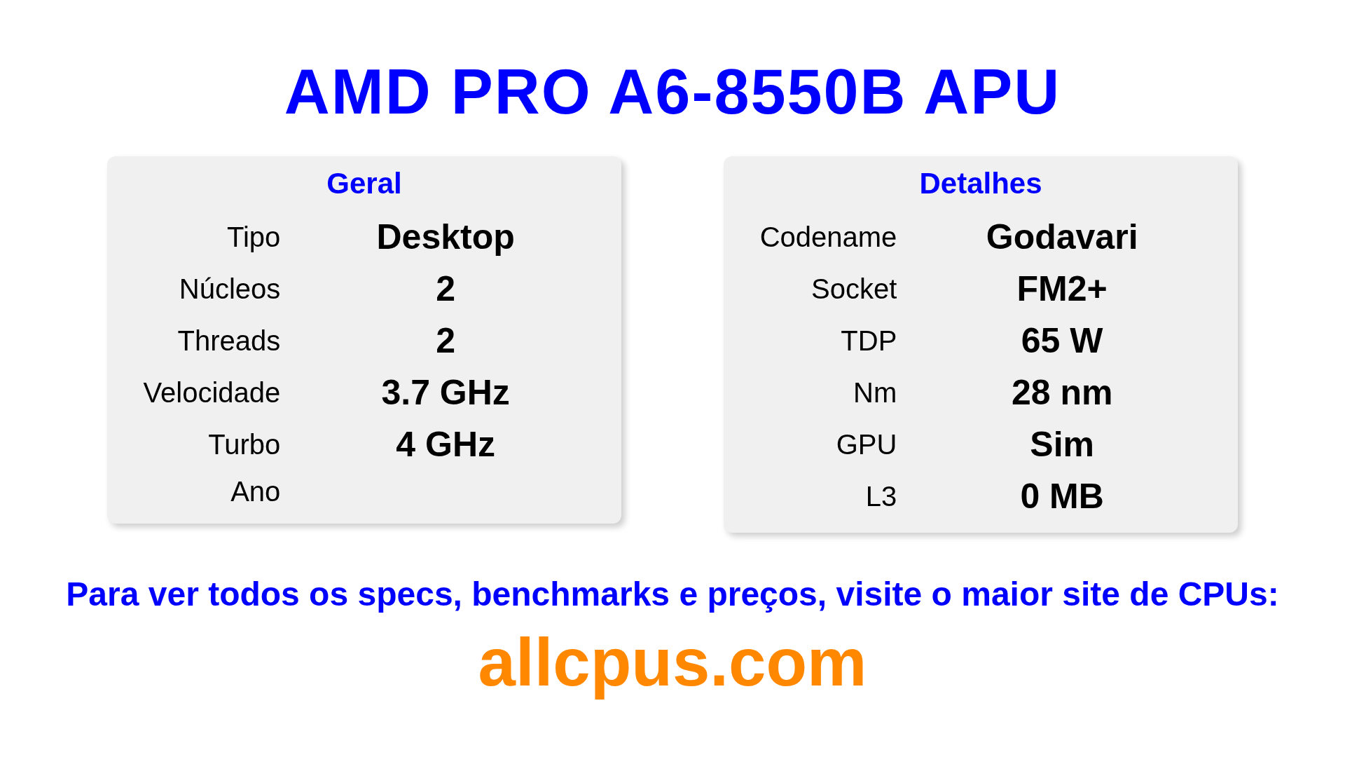 O AMD PRO A6-8550B APU é um AMD processador de desktop da linha PRO A-Series, baseado na arquitetura Godavari e lançado em . Este CPU possui 2 núcleos, clock base de 3700 MHz, frequência turbo máxima de 4000 MHz e 0 MB de cache L3. Fabricado usando tecnologia de processo de 28 nm.O AMD PRO A6-8550B APU é projetado para o socket FM2+. Inclui gráficos integrados AMD Radeon R5 Graphics.