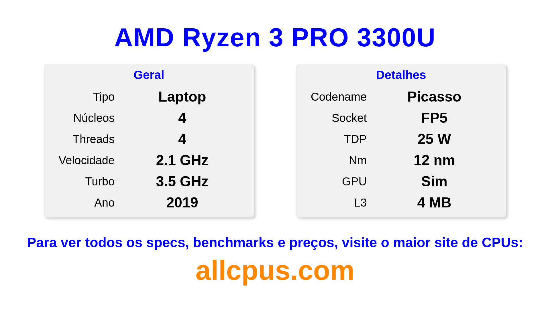 O AMD Ryzen 3 PRO 3300U é um AMD processador de notebook da linha Ryzen PRO, baseado na arquitetura Picasso e lançado em 2019. Este CPU possui 4 núcleos, clock base de 2100 MHz, frequência turbo máxima de 3500 MHz e 4 MB de cache L3. Fabricado usando tecnologia de processo de 12 nm.O AMD Ryzen 3 PRO 3300U é projetado para o socket FP5. Inclui gráficos integrados Radeon Vega 6 Graphics.