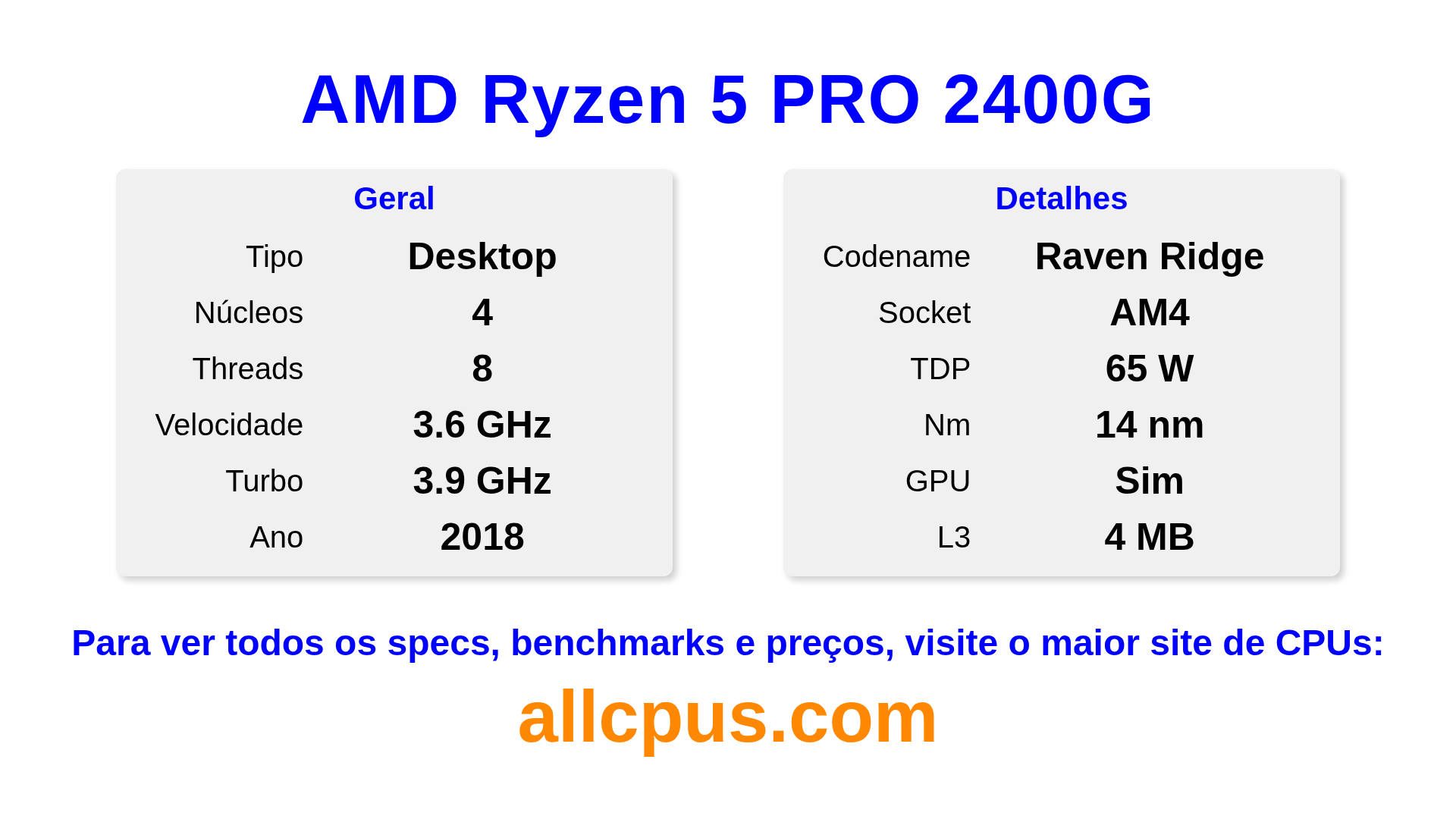 O AMD Ryzen 5 PRO 2400G é um AMD processador de desktop da linha Ryzen PRO, baseado na arquitetura Raven Ridge e lançado em 2018. Este CPU possui 4 núcleos, clock base de 3600 MHz, frequência turbo máxima de 3900 MHz e 4 MB de cache L3. Fabricado usando tecnologia de processo de 14 nm.O AMD Ryzen 5 PRO 2400G é projetado para o socket AM4. Inclui gráficos integrados Radeon Vega 11 Graphics.