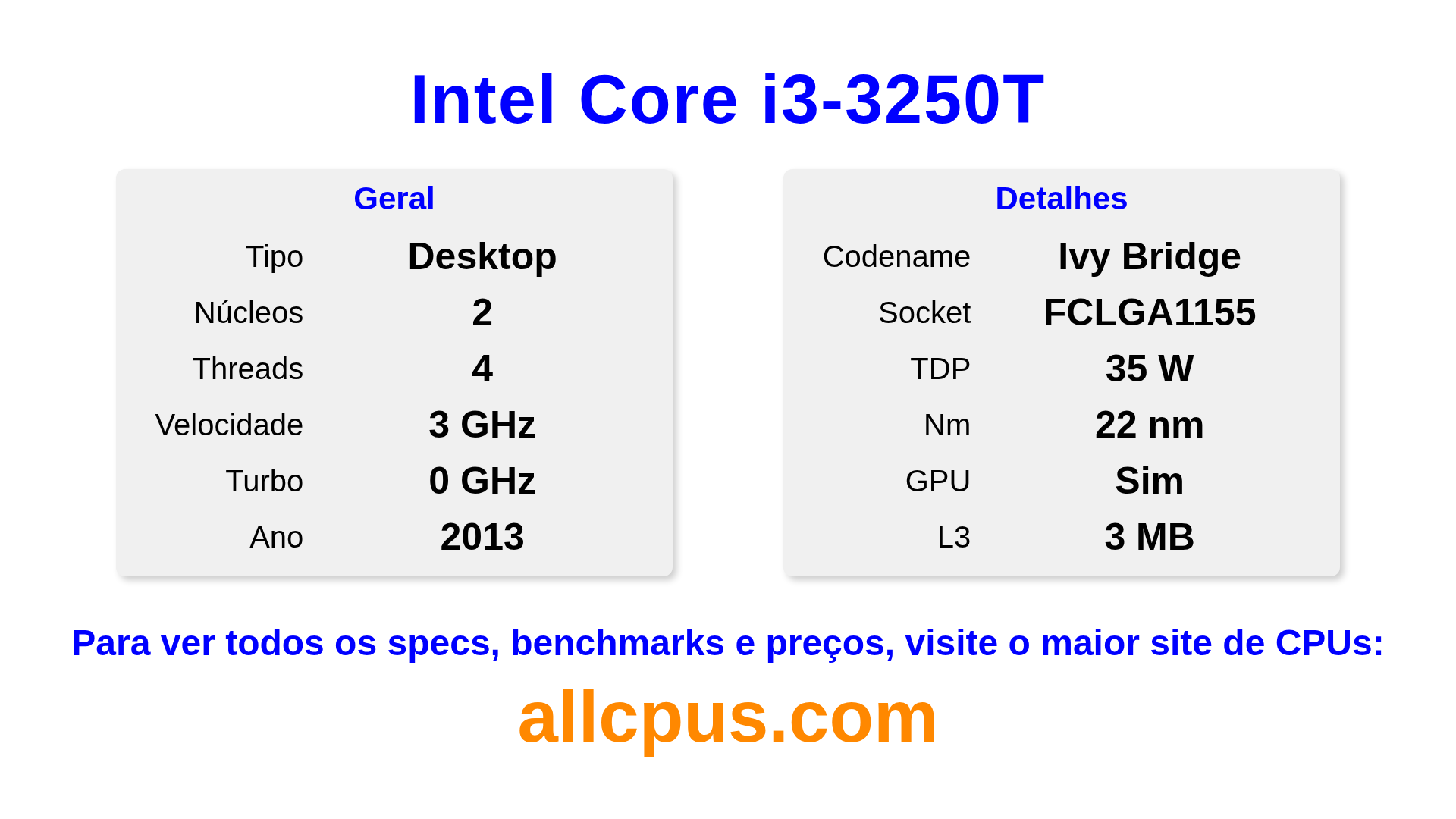 O Intel Core i3-3250T é um Intel processador de desktop da linha Intel Core, baseado na arquitetura Ivy Bridge e lançado em 2013. Este CPU possui 2 núcleos, clock base de 3000 MHz, frequência turbo máxima de 0 MHz e 3 MB de cache L3. Fabricado usando tecnologia de processo de 22 nm.O Intel Core i3-3250T é projetado para o socket LGA1155. Inclui gráficos integrados Intel® HD Graphics 2500.
