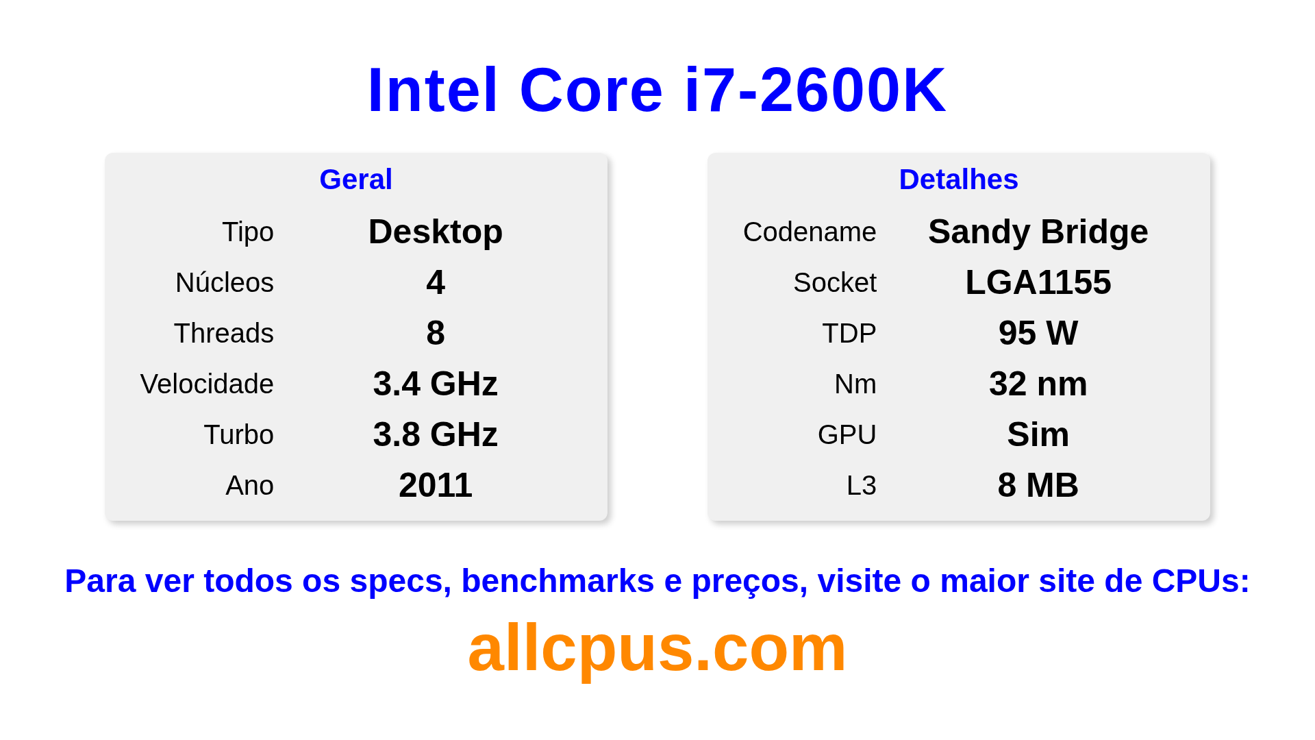 O Intel Core i7-2600K é um Intel processador de desktop da linha Intel Core, baseado na arquitetura Sandy Bridge e lançado em 2011. Este CPU possui 4 núcleos, clock base de 3400 MHz, frequência turbo máxima de 3800 MHz e 8 MB de cache L3. Fabricado usando tecnologia de processo de 32 nm.O Intel Core i7-2600K é projetado para o socket LGA1155.Suporta overclock. Inclui gráficos integrados Intel® HD Graphics 3000.
