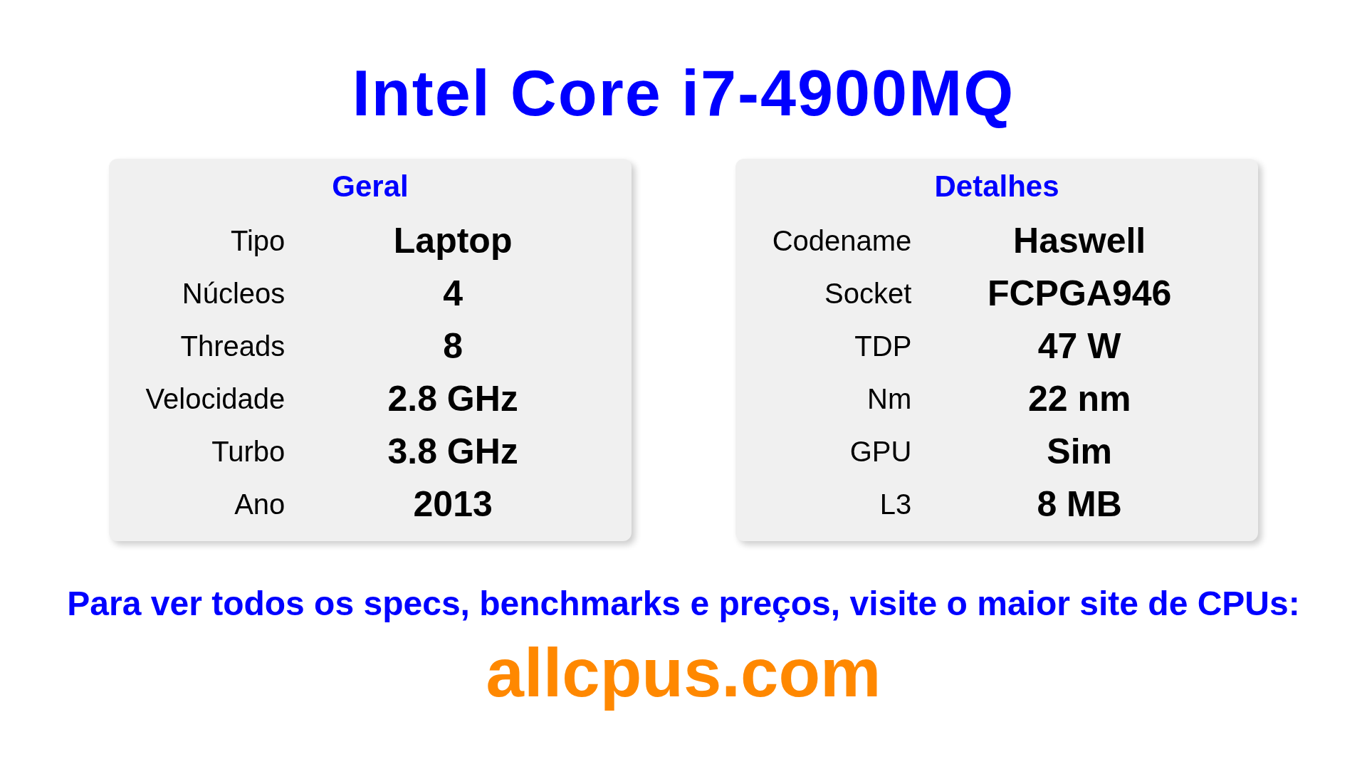 Intel Core i7-4900MQ is better than 35% cpus with score 55Neste gráfico você pode ver para quais tarefas esta CPU é boa. As pontuações são Blender Benchmark Scores A pontuação do Blender representa o desempenho total multi-core do processador sob carga pesada sustentada. Mostra bem a potência total do processador..