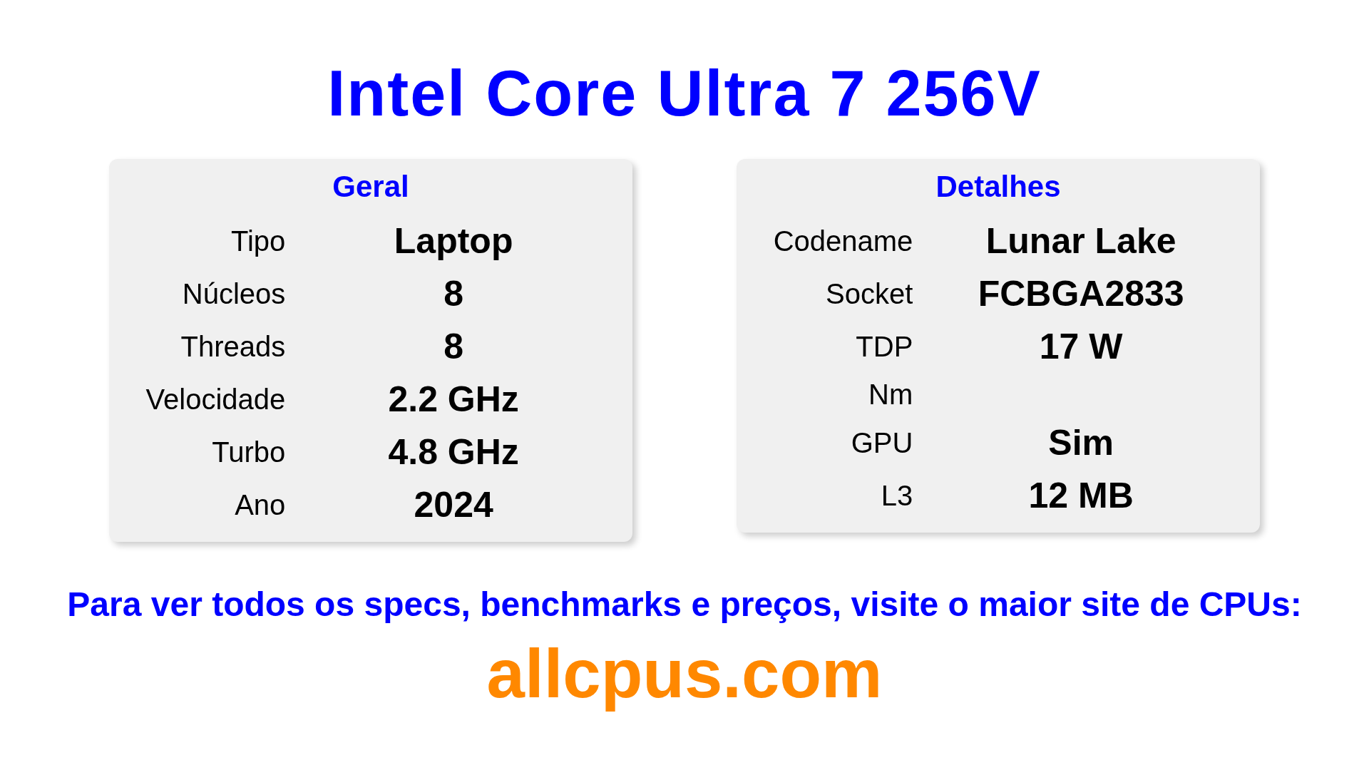 O Intel Core Ultra 7 256V é um Intel processador de notebook da linha Intel Core Ultra, baseado na arquitetura Lunar Lake e lançado em 2024. Este CPU possui 8 núcleos, clock base de 2200 MHz, frequência turbo máxima de 4800 MHz e 12 MB de cache L3. O Intel Core Ultra 7 256V é projetado para o socket BGA2833. Inclui gráficos integrados Intel® Arc™ 140V GPU.