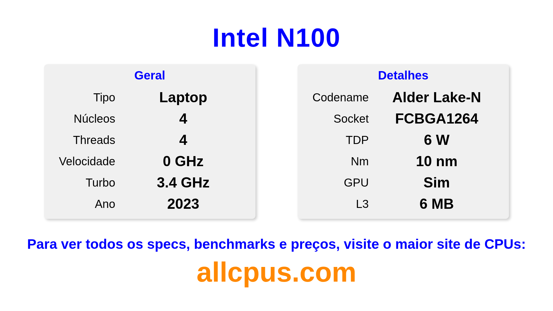 O Intel N100 é um Intel processador de notebook da linha Intel Processor, baseado na arquitetura Alder Lake-N e lançado em 2023. Este CPU possui 4 núcleos, clock base de 0 MHz, frequência turbo máxima de 3400 MHz e 6 MB de cache L3. Fabricado usando tecnologia de processo de 10 nm.O Intel N100 é projetado para o socket BGA1264. Inclui gráficos integrados Intel® UHD Graphics.