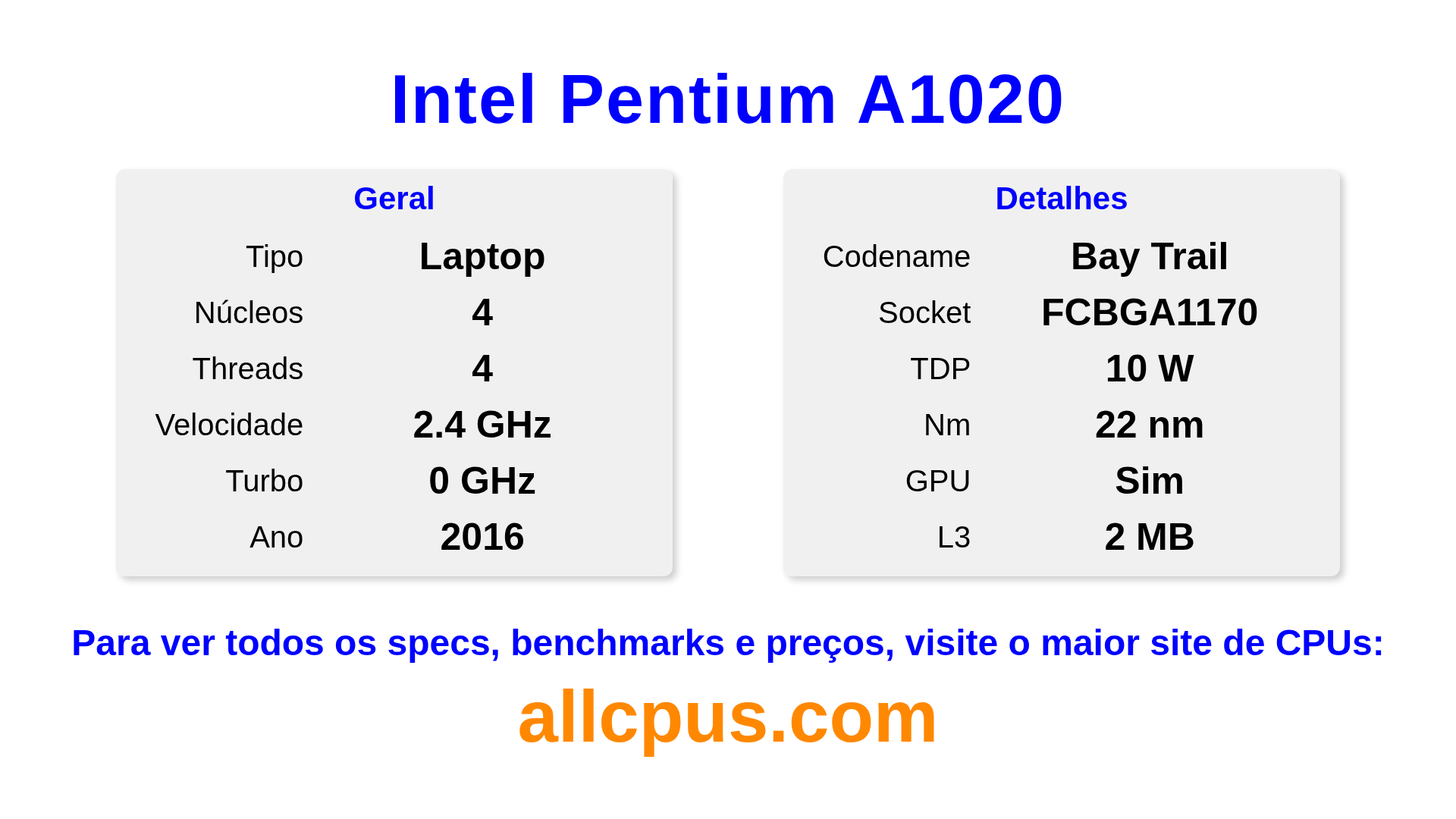 O Intel Pentium A1020 é um Intel processador de notebook da linha Intel® Pentium®, baseado na arquitetura Bay Trail e lançado em 2016. Este CPU possui 4 núcleos, clock base de 2410 MHz, frequência turbo máxima de 0 MHz e 2 MB de cache L3. Fabricado usando tecnologia de processo de 22 nm.O Intel Pentium A1020 é projetado para o socket BGA1170. Inclui gráficos integrados Intel® HD Graphics for Intel Atom® Processor Z3700 Series.