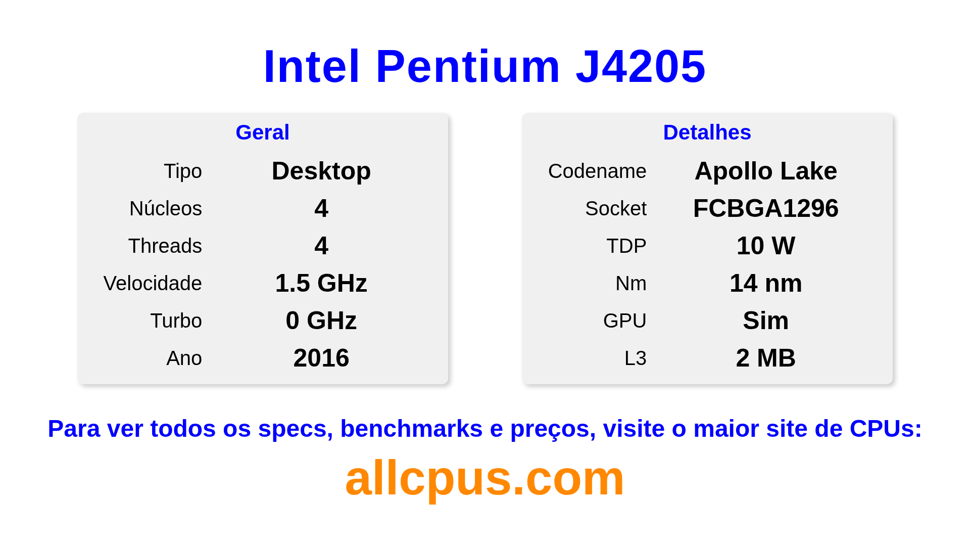 O Intel Pentium J4205 é um Intel processador de desktop da linha Intel® Pentium®, baseado na arquitetura Apollo Lake e lançado em 2016. Este CPU possui 4 núcleos, clock base de 1500 MHz, frequência turbo máxima de 0 MHz e 2 MB de cache L3. Fabricado usando tecnologia de processo de 14 nm.O Intel Pentium J4205 é projetado para o socket BGA1296. Inclui gráficos integrados Intel® HD Graphics 505.