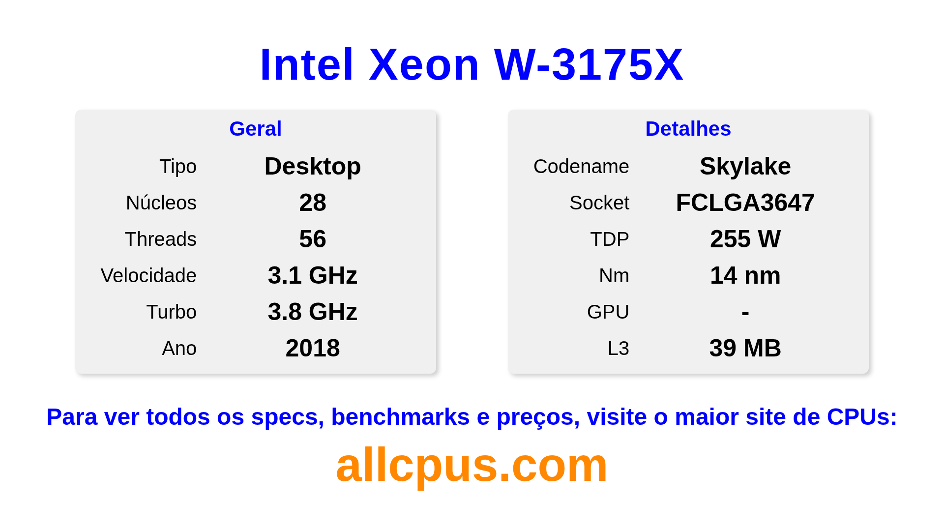 O Intel Xeon W-3175X é um Intel processador de desktop da linha Intel Xeon, baseado na arquitetura Skylake e lançado em 2018. Este CPU possui 28 núcleos, clock base de 3100 MHz, frequência turbo máxima de 3800 MHz e 39 MB de cache L3. Fabricado usando tecnologia de processo de 14 nm.O Intel Xeon W-3175X é projetado para o socket LGA3647.Suporta overclock. Uma placa de vídeo dedicada é necessária.