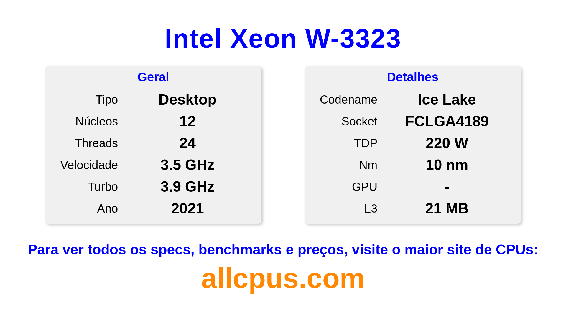 O Intel Xeon W-3323 é um Intel processador de desktop da linha Intel Xeon, baseado na arquitetura Ice Lake e lançado em 2021. Este CPU possui 12 núcleos, clock base de 3500 MHz, frequência turbo máxima de 3900 MHz e 21 MB de cache L3. Fabricado usando tecnologia de processo de 10 nm.O Intel Xeon W-3323 é projetado para o socket LGA4189. Uma placa de vídeo dedicada é necessária.