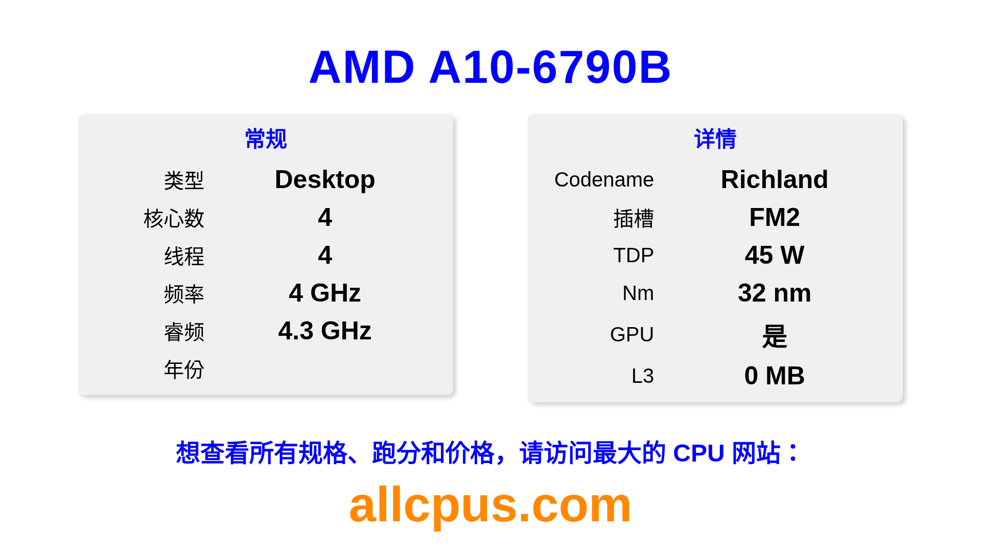 AMD A10-6790B 是 AMD A-Series 系列的 桌面处理器,基于 Richland 架构,于 发布。 这款 CPU 拥有 4 核心,基础频率为 4000 MHz,最高加速频率为 4300 MHz,L3 缓存为 0 MB。 使用 32 nm 工艺制造。AMD A10-6790B 设计用于 FM2 插槽。 包括集成的 AMD Radeon HD 8670D 显卡。