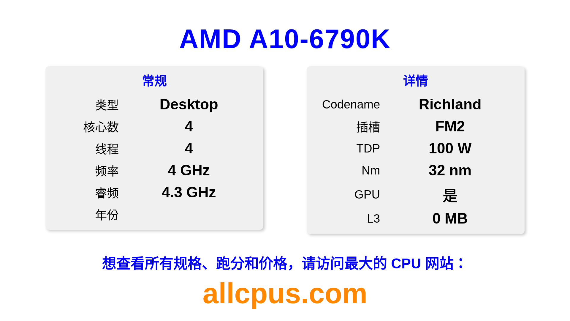 AMD A10-6790K 是 AMD A-Series 系列的 桌面处理器,基于 Richland 架构,于 发布。 这款 CPU 拥有 4 核心,基础频率为 4000 MHz,最高加速频率为 4300 MHz,L3 缓存为 0 MB。 使用 32 nm 工艺制造。AMD A10-6790K 设计用于 FM2 插槽。支持超频。 包括集成的 AMD Radeon HD 8670D 显卡。