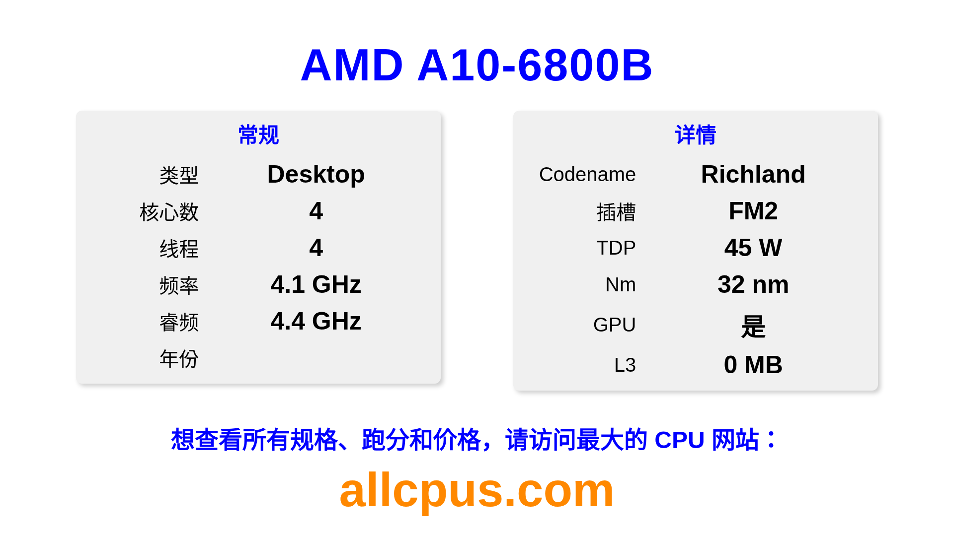 AMD A10-6800B 是 AMD A-Series 系列的 桌面处理器,基于 Richland 架构,于 发布。 这款 CPU 拥有 4 核心,基础频率为 4100 MHz,最高加速频率为 4400 MHz,L3 缓存为 0 MB。 使用 32 nm 工艺制造。AMD A10-6800B 设计用于 FM2 插槽。 包括集成的 AMD Radeon HD 8670D 显卡。