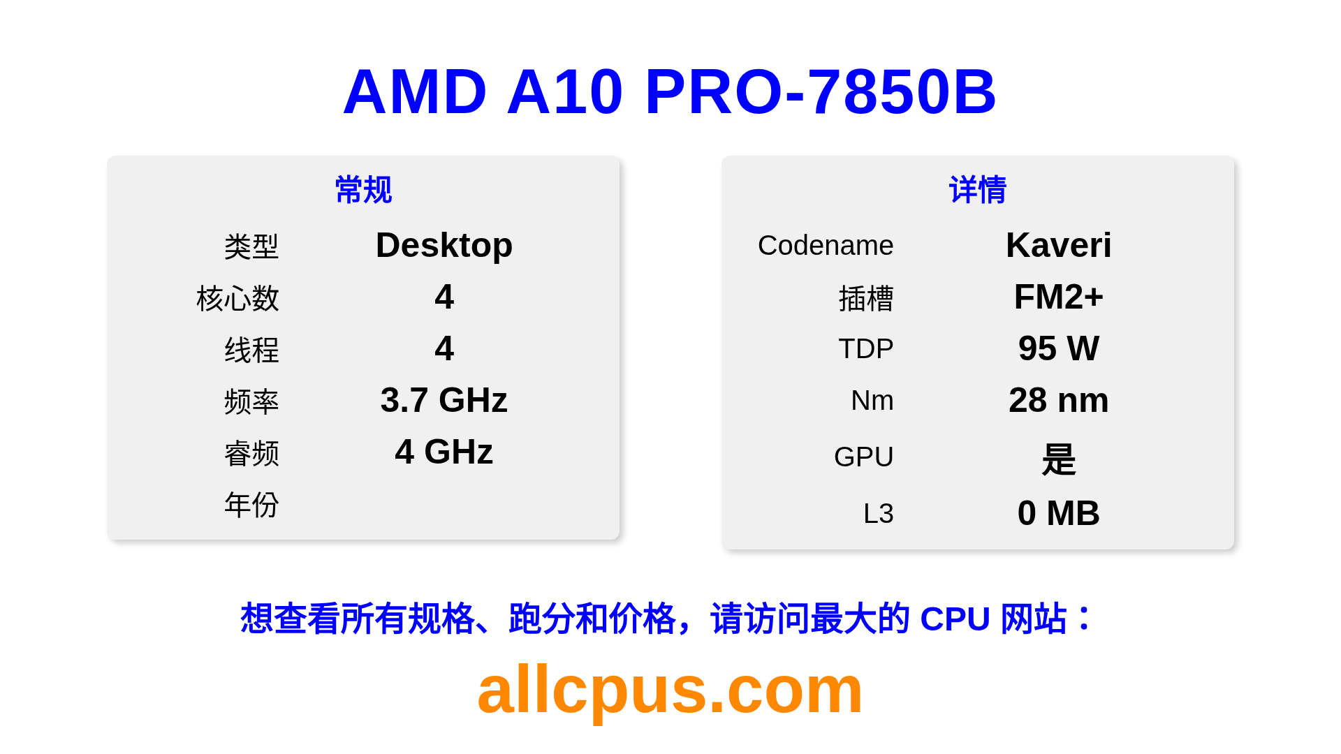 AMD A10 PRO-7850B 是 AMD PRO A-Series 系列的 桌面处理器,基于 Kaveri 架构,于 发布。 这款 CPU 拥有 4 核心,基础频率为 3700 MHz,最高加速频率为 4000 MHz,L3 缓存为 0 MB。 使用 28 nm 工艺制造。AMD A10 PRO-7850B 设计用于 FM2+ 插槽。 包括集成的 AMD Radeon R7 Graphics 显卡。