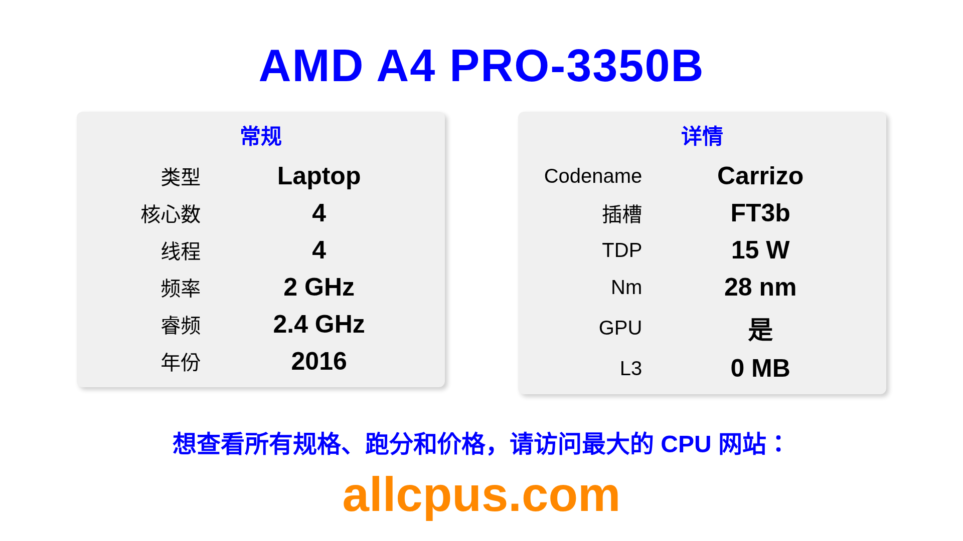 AMD A4 PRO-3350B 是 AMD PRO A-Series 系列的 笔记本处理器,基于 Carrizo 架构,于 2016 发布。 这款 CPU 拥有 4 核心,基础频率为 2000 MHz,最高加速频率为 2400 MHz,L3 缓存为 0 MB。 使用 28 nm 工艺制造。AMD A4 PRO-3350B 设计用于 FT3b 插槽。 包括集成的 AMD Radeon R4 Graphics 显卡。