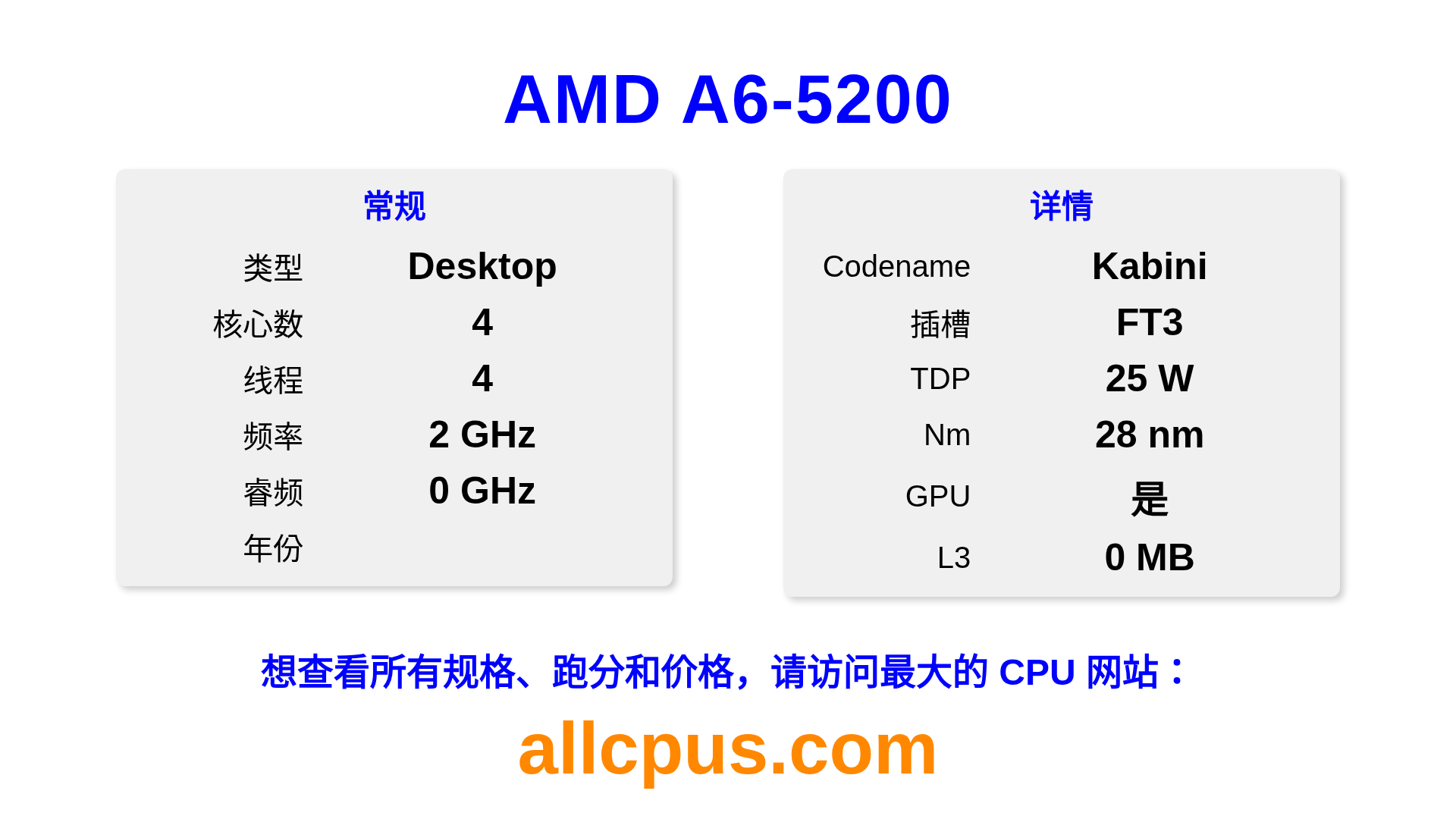 AMD A6-5200 是 AMD A-Series 系列的 桌面处理器,基于 Kabini 架构,于 发布。 这款 CPU 拥有 4 核心,基础频率为 2000 MHz,最高加速频率为 0 MHz,L3 缓存为 0 MB。 使用 28 nm 工艺制造。AMD A6-5200 设计用于 FT3 插槽。 包括集成的 AMD Radeon HD 8400 显卡。