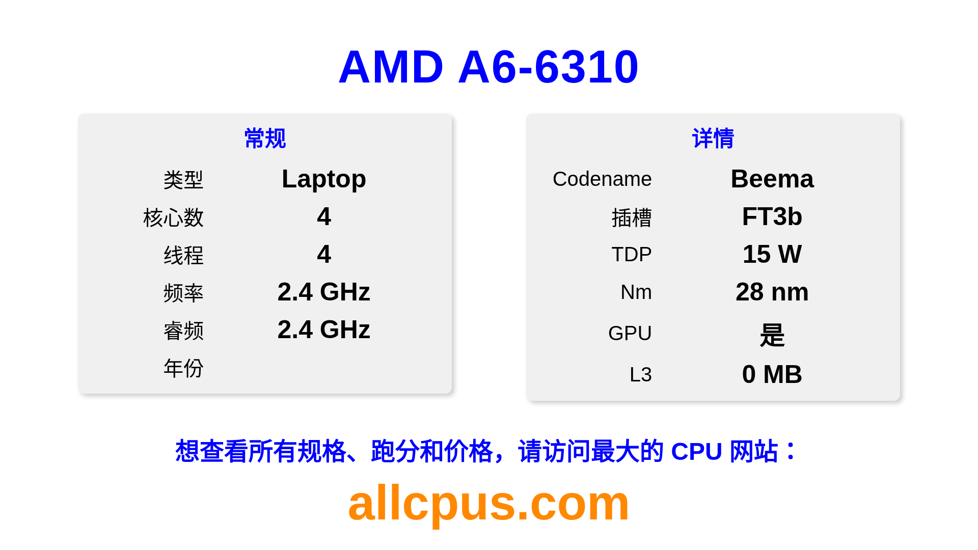 AMD A6-6310 是 AMD A-Series 系列的 笔记本处理器,基于 Beema 架构,于 发布。 这款 CPU 拥有 4 核心,基础频率为 2400 MHz,最高加速频率为 2400 MHz,L3 缓存为 0 MB。 使用 28 nm 工艺制造。AMD A6-6310 设计用于 FT3b 插槽。 包括集成的 AMD Radeon R4 Graphics 显卡。