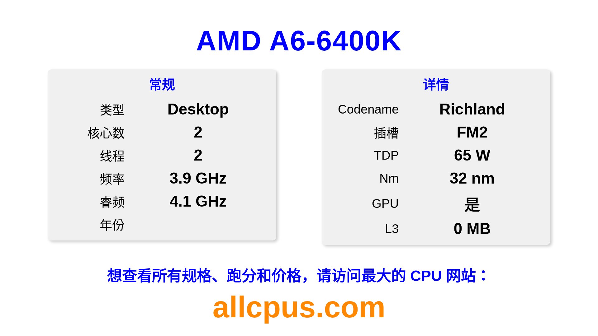 AMD A6-6400K 是 AMD A-Series 系列的 桌面处理器,基于 Richland 架构,于 发布。 这款 CPU 拥有 2 核心,基础频率为 3900 MHz,最高加速频率为 4100 MHz,L3 缓存为 0 MB。 使用 32 nm 工艺制造。AMD A6-6400K 设计用于 FM2 插槽。支持超频。 包括集成的 AMD Radeon HD 8470D 显卡。