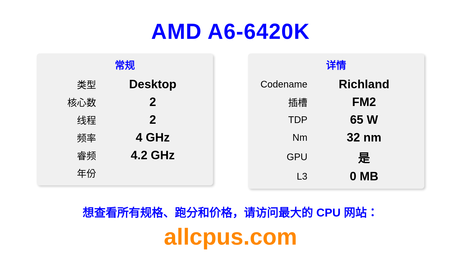 AMD A6-6420K 是 AMD A-Series 系列的 桌面处理器,基于 Richland 架构,于 发布。 这款 CPU 拥有 2 核心,基础频率为 4000 MHz,最高加速频率为 4200 MHz,L3 缓存为 0 MB。 使用 32 nm 工艺制造。AMD A6-6420K 设计用于 FM2 插槽。支持超频。 包括集成的 AMD Radeon HD 8470D 显卡。