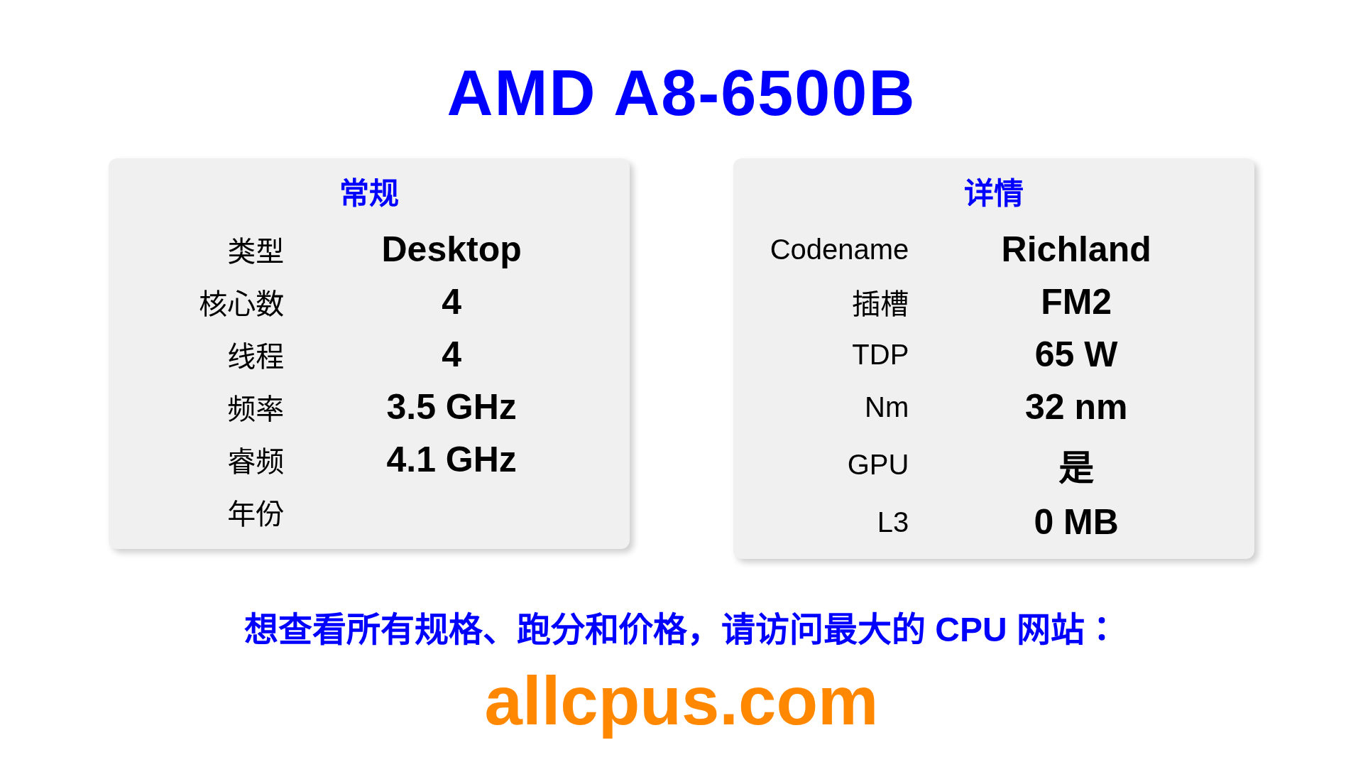 AMD A8-6500B 是 AMD A-Series 系列的 桌面处理器,基于 Richland 架构,于 发布。 这款 CPU 拥有 4 核心,基础频率为 3500 MHz,最高加速频率为 4100 MHz,L3 缓存为 0 MB。 使用 32 nm 工艺制造。AMD A8-6500B 设计用于 FM2 插槽。 包括集成的 AMD Radeon HD 8570D 显卡。