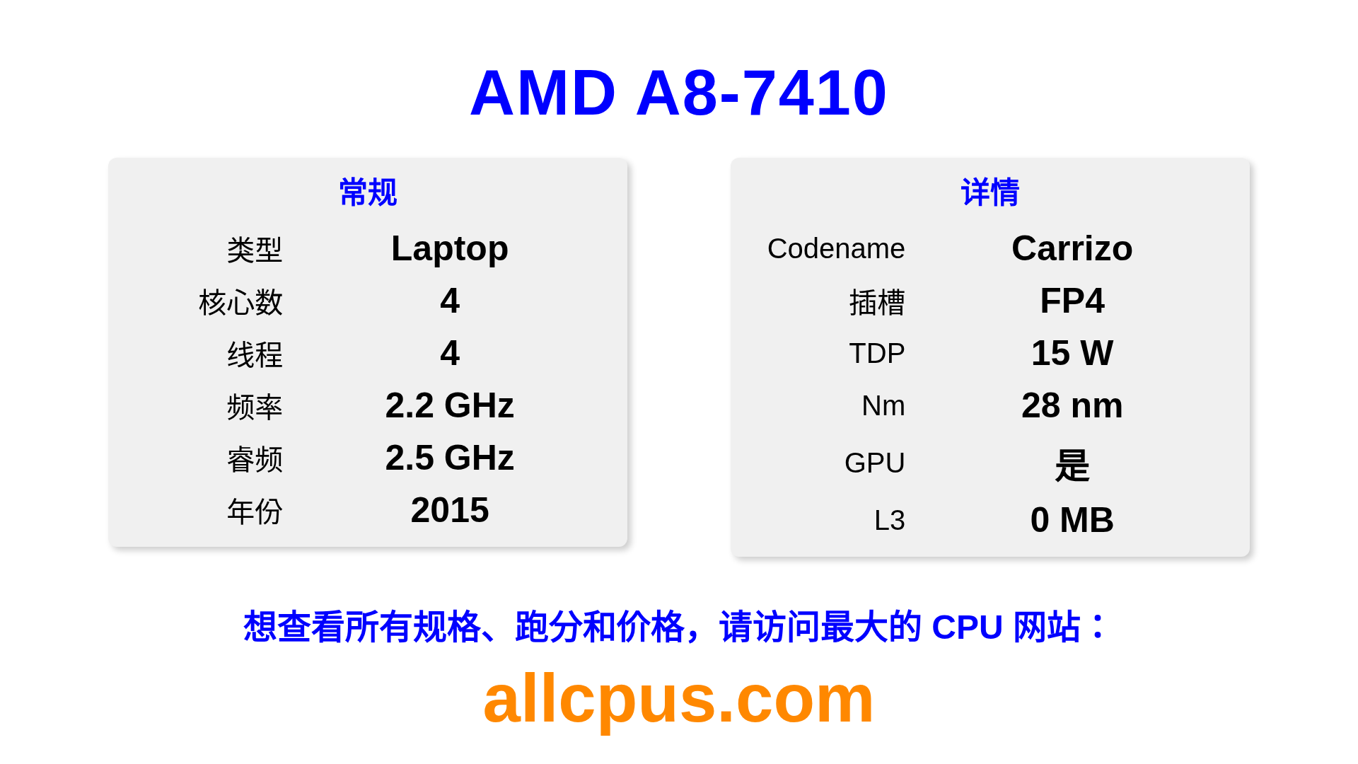 AMD A8-7410 是 AMD A-Series 系列的 笔记本处理器,基于 Carrizo 架构,于 2015 发布。 这款 CPU 拥有 4 核心,基础频率为 2200 MHz,最高加速频率为 2500 MHz,L3 缓存为 0 MB。 使用 28 nm 工艺制造。AMD A8-7410 设计用于 FP4 插槽。 包括集成的 AMD Radeon R5 Graphics 显卡。