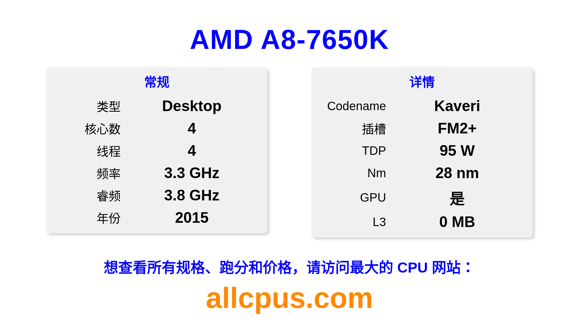 AMD A8-7650K 是 AMD A-Series 系列的 桌面处理器,基于 Kaveri 架构,于 2015 发布。 这款 CPU 拥有 4 核心,基础频率为 3300 MHz,最高加速频率为 3800 MHz,L3 缓存为 0 MB。 使用 28 nm 工艺制造。AMD A8-7650K 设计用于 FM2+ 插槽。支持超频。 包括集成的 AMD Radeon R7 Graphics 显卡。