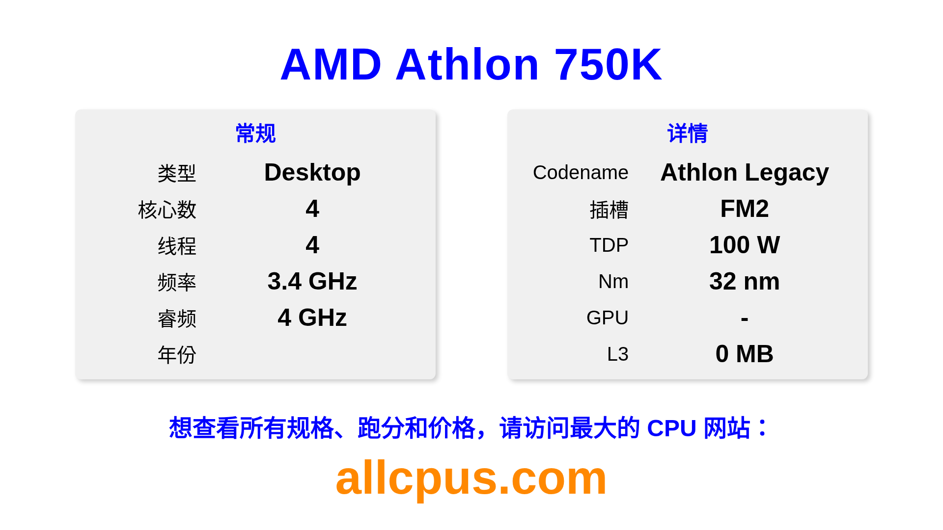AMD Athlon 750K 是 AMD Athlon 系列的 桌面处理器,基于 Athlon Legacy 架构,于 发布。 这款 CPU 拥有 4 核心,基础频率为 3400 MHz,最高加速频率为 4000 MHz,L3 缓存为 0 MB。 使用 32 nm 工艺制造。AMD Athlon 750K 设计用于 FM2 插槽。 需要独立显卡。
