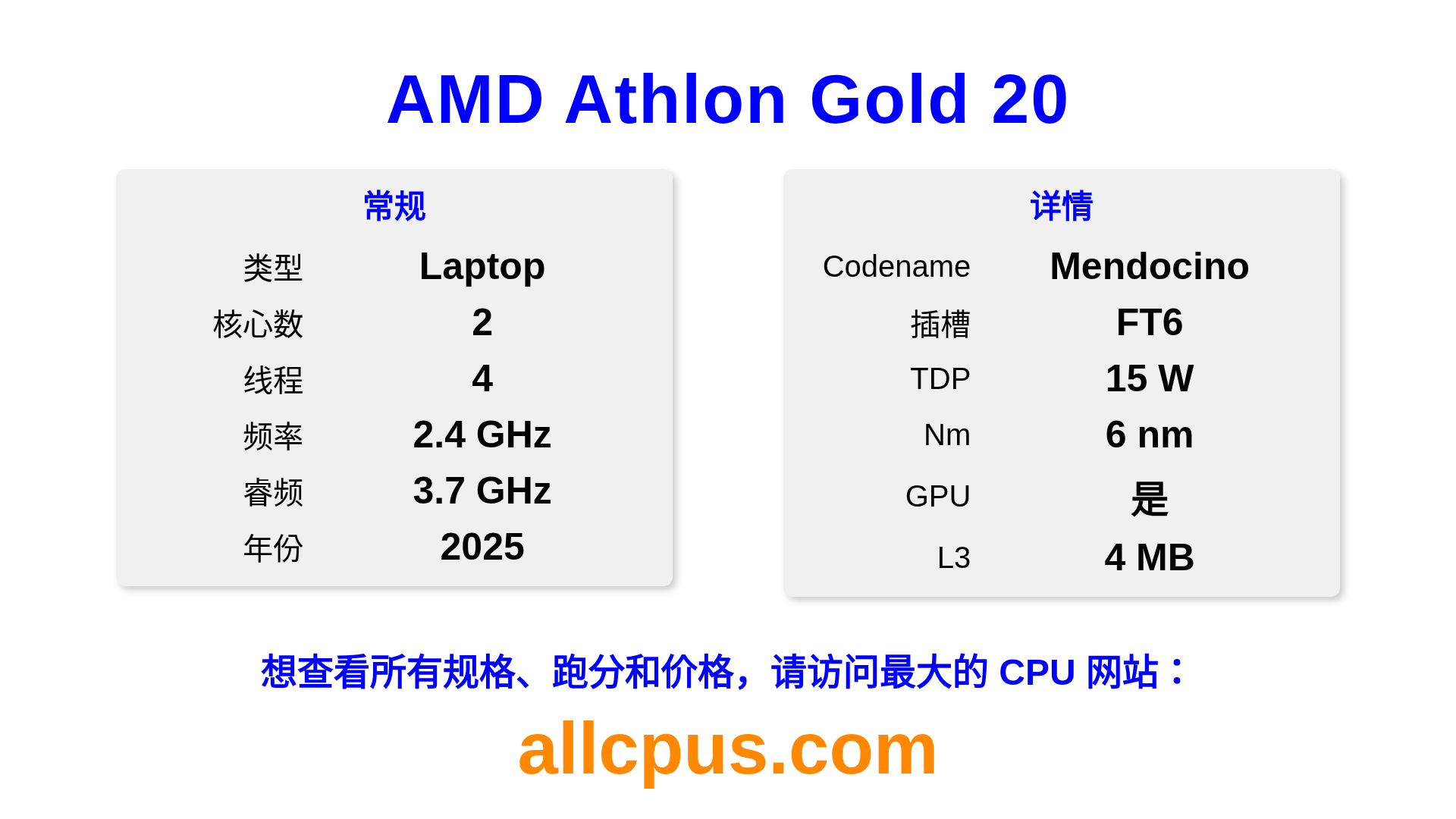 AMD Athlon Gold 20 是 AMD Athlon 系列的 笔记本处理器,基于 Mendocino 架构,于 2025 发布。 这款 CPU 拥有 2 核心,基础频率为 2400 MHz,最高加速频率为 3700 MHz,L3 缓存为 4 MB。 使用 6 nm 工艺制造。AMD Athlon Gold 20 设计用于 FT6 插槽。 包括集成的 AMD Radeon 610M 显卡。
