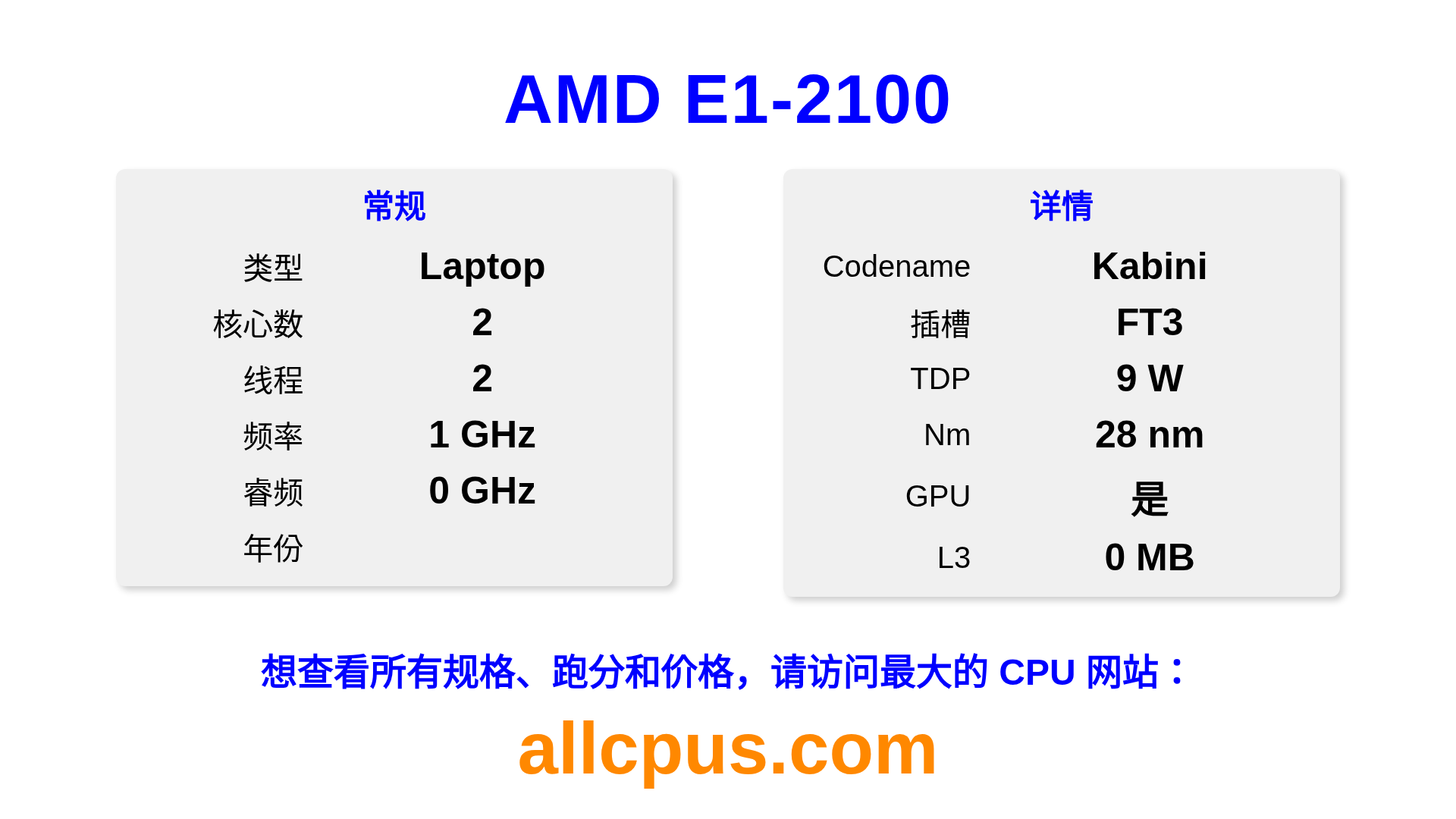 AMD E1-2100 是 AMD E-Series 系列的 笔记本处理器,基于 Kabini 架构,于 发布。 这款 CPU 拥有 2 核心,基础频率为 1000 MHz,最高加速频率为 0 MHz,L3 缓存为 0 MB。 使用 28 nm 工艺制造。AMD E1-2100 设计用于 FT3 插槽。 包括集成的 AMD Radeon HD 8210 显卡。