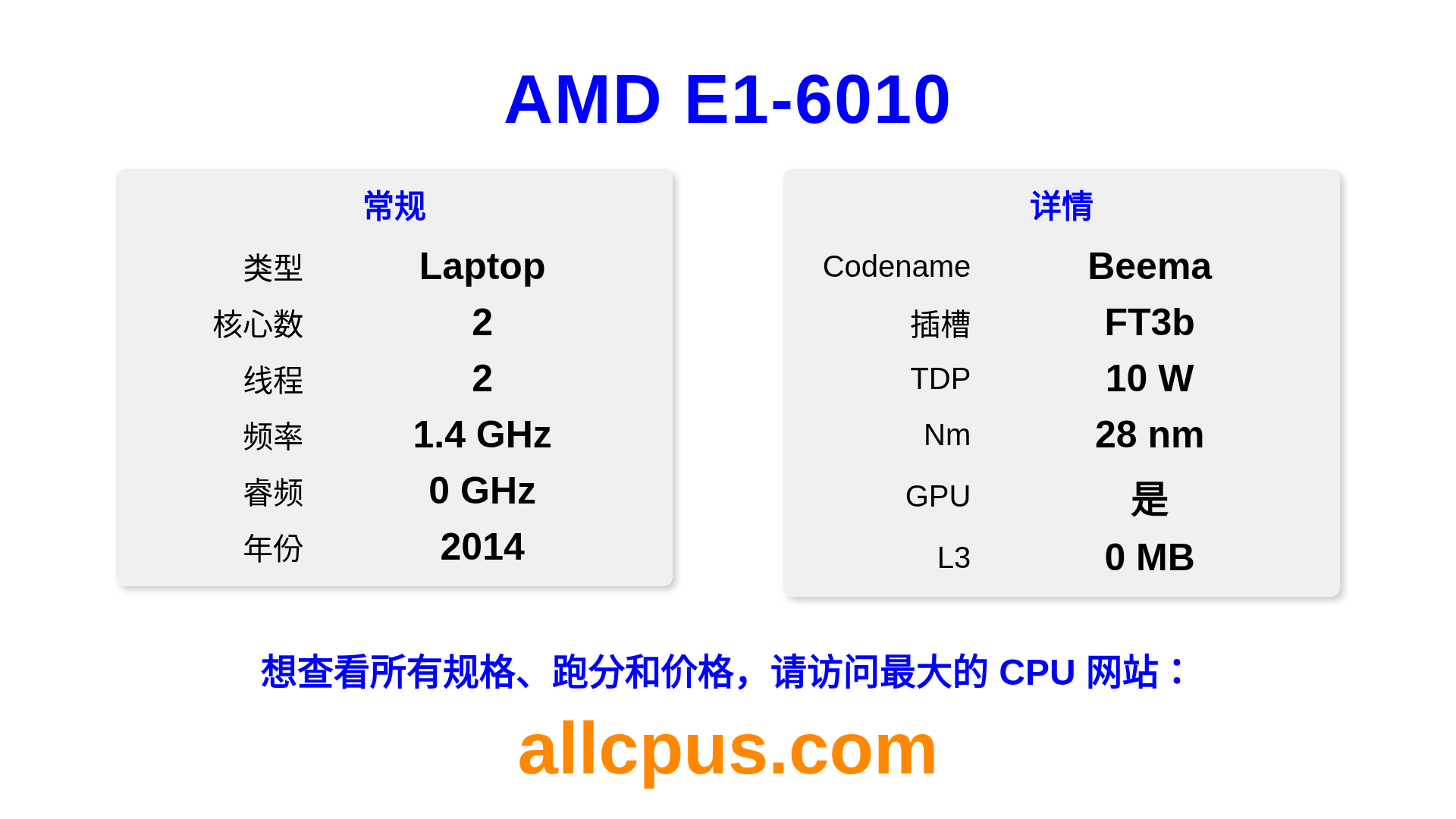 AMD E1-6010 是 AMD E-Series 系列的 笔记本处理器,基于 Beema 架构,于 2014 发布。 这款 CPU 拥有 2 核心,基础频率为 1350 MHz,最高加速频率为 0 MHz,L3 缓存为 0 MB。 使用 28 nm 工艺制造。AMD E1-6010 设计用于 FT3b 插槽。 包括集成的 AMD Radeon R2 Graphics 显卡。