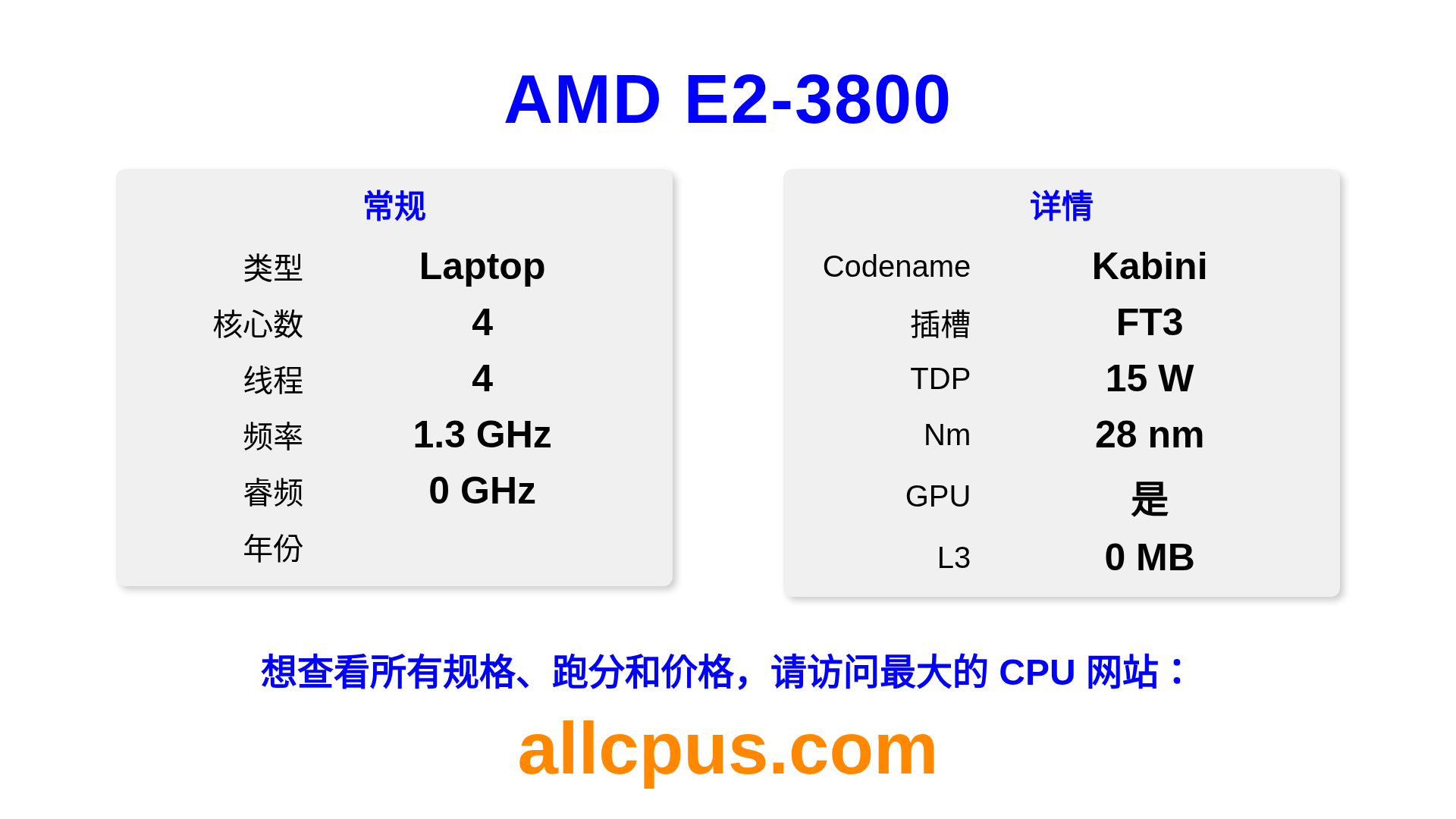 AMD E2-3800 是 AMD E-Series 系列的 笔记本处理器,基于 Kabini 架构,于 发布。 这款 CPU 拥有 4 核心,基础频率为 1300 MHz,最高加速频率为 0 MHz,L3 缓存为 0 MB。 使用 28 nm 工艺制造。AMD E2-3800 设计用于 FT3 插槽。 包括集成的 AMD Radeon HD 8280 显卡。