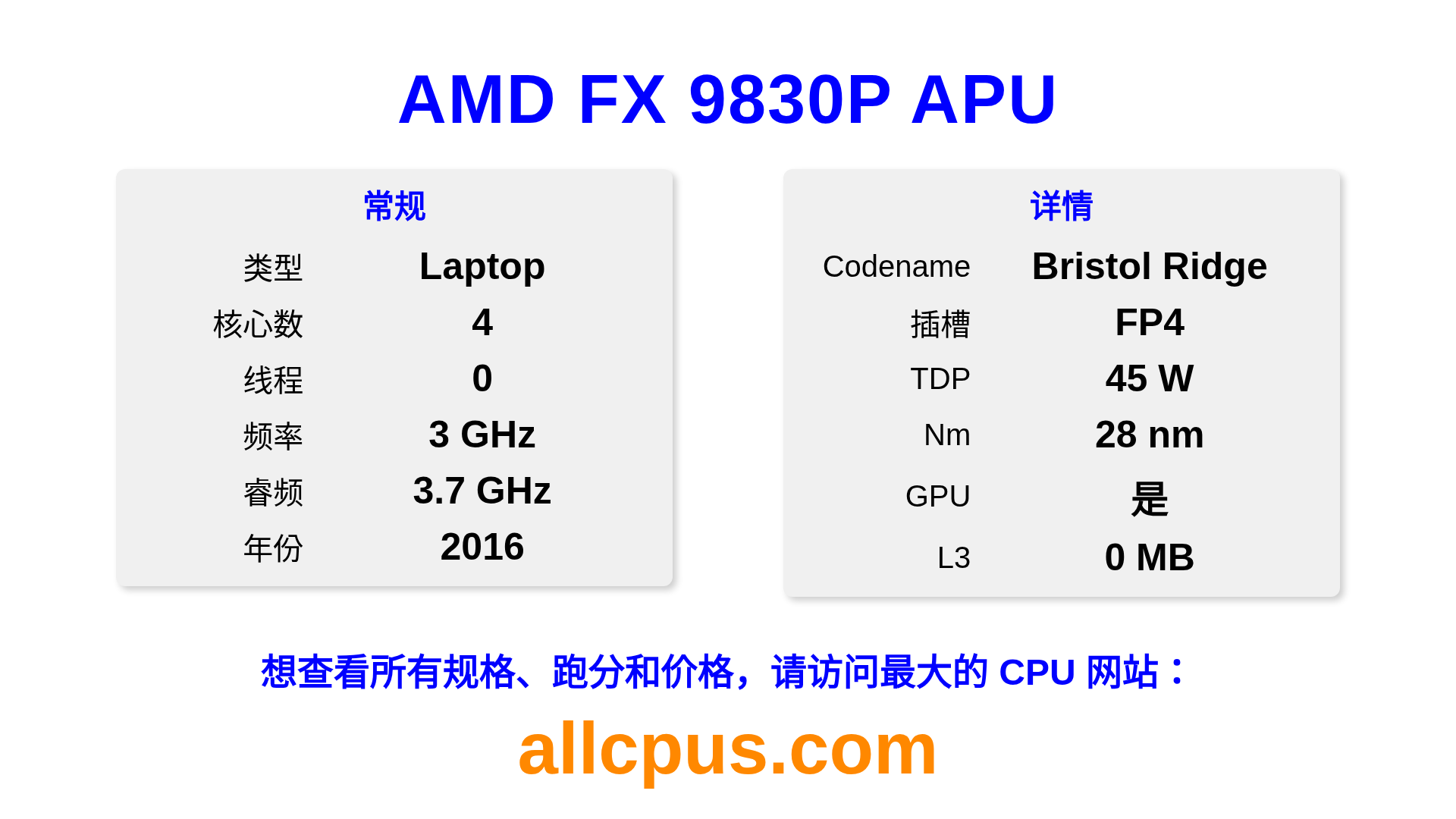 AMD FX 9830P APU 是 AMD FX-Series 系列的 笔记本处理器,基于 Bristol Ridge 架构,于 2016 发布。 这款 CPU 拥有 4 核心,基础频率为 3000 MHz,最高加速频率为 3700 MHz,L3 缓存为 0 MB。 使用 28 nm 工艺制造。AMD FX 9830P APU 设计用于 FP4 插槽。 包括集成的 AMD Radeon R7 Graphics 显卡。