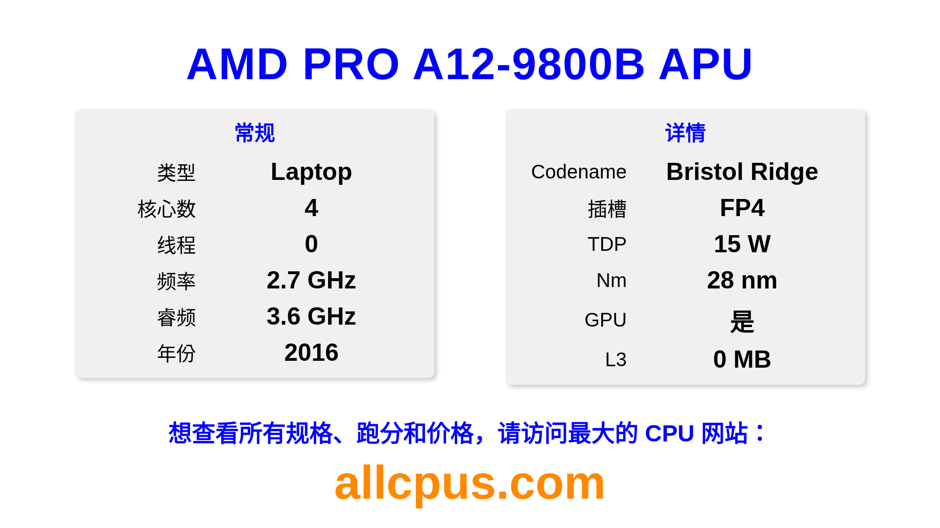 AMD PRO A12-9800B APU 是 AMD PRO A-Series 系列的 笔记本处理器,基于 Bristol Ridge 架构,于 2016 发布。 这款 CPU 拥有 4 核心,基础频率为 2700 MHz,最高加速频率为 3600 MHz,L3 缓存为 0 MB。 使用 28 nm 工艺制造。AMD PRO A12-9800B APU 设计用于 FP4 插槽。 包括集成的 R7 显卡。