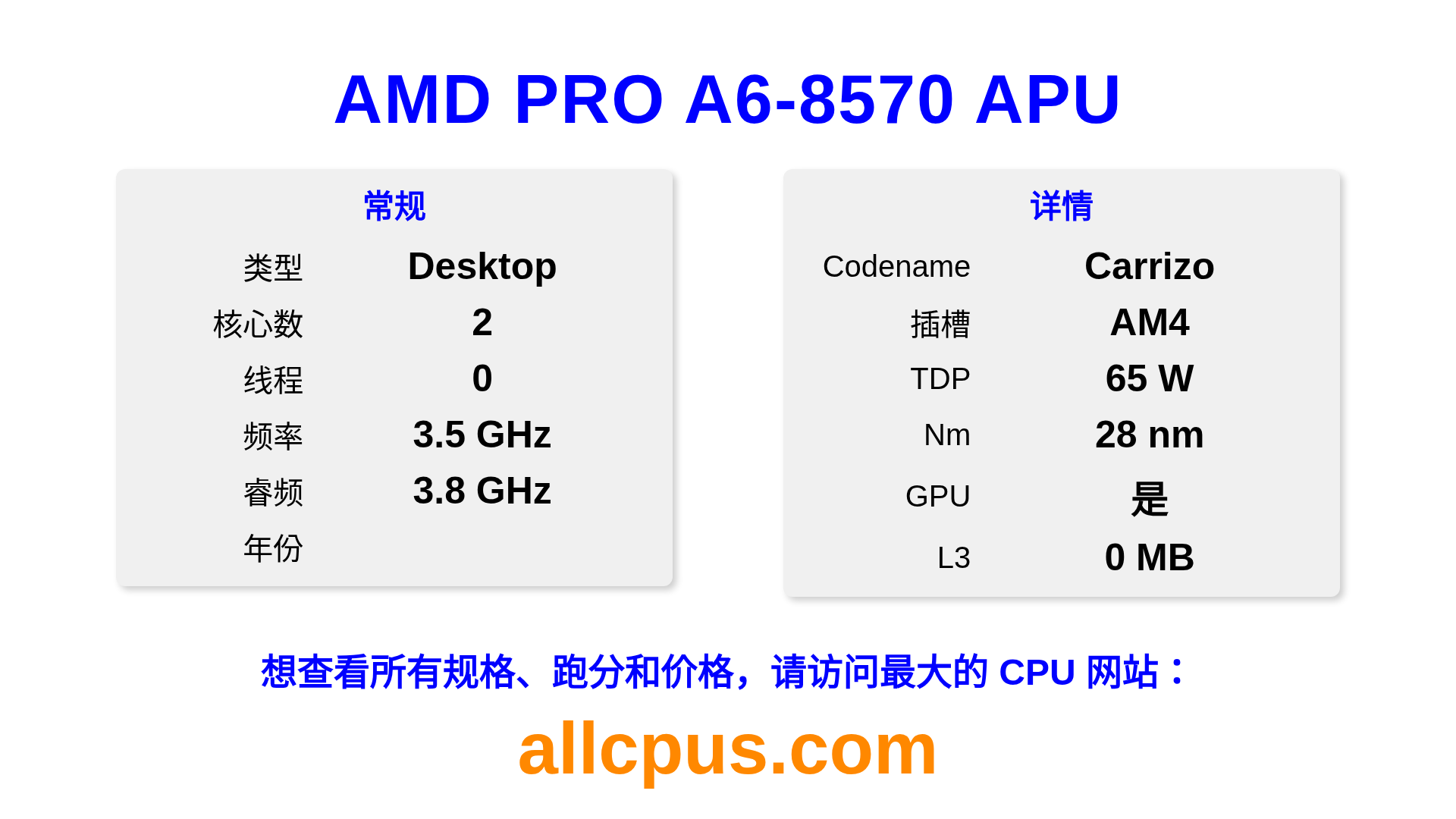 AMD PRO A6-8570 APU 是 AMD PRO A-Series 系列的 桌面处理器,基于 Carrizo 架构,于 发布。 这款 CPU 拥有 2 核心,基础频率为 3500 MHz,最高加速频率为 3800 MHz,L3 缓存为 0 MB。 使用 28 nm 工艺制造。AMD PRO A6-8570 APU 设计用于 AM4 插槽。 包括集成的 R5 显卡。