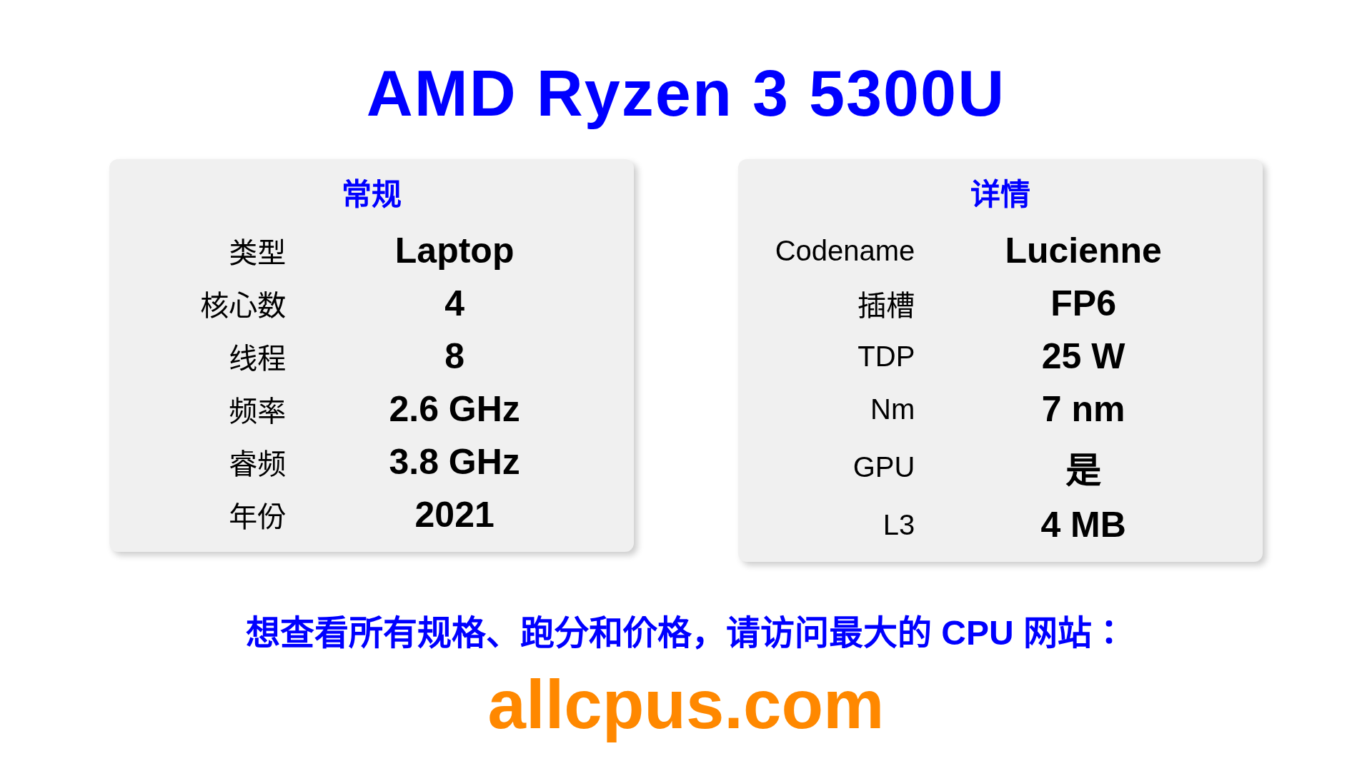 AMD Ryzen 3 5300U 是 AMD Ryzen 系列的 笔记本处理器,基于 Lucienne 架构,于 2021 发布。 这款 CPU 拥有 4 核心,基础频率为 2600 MHz,最高加速频率为 3800 MHz,L3 缓存为 4 MB。 使用 7 nm 工艺制造。AMD Ryzen 3 5300U 设计用于 FP6 插槽。支持超频。 包括集成的 AMD Radeon Graphics 显卡。
