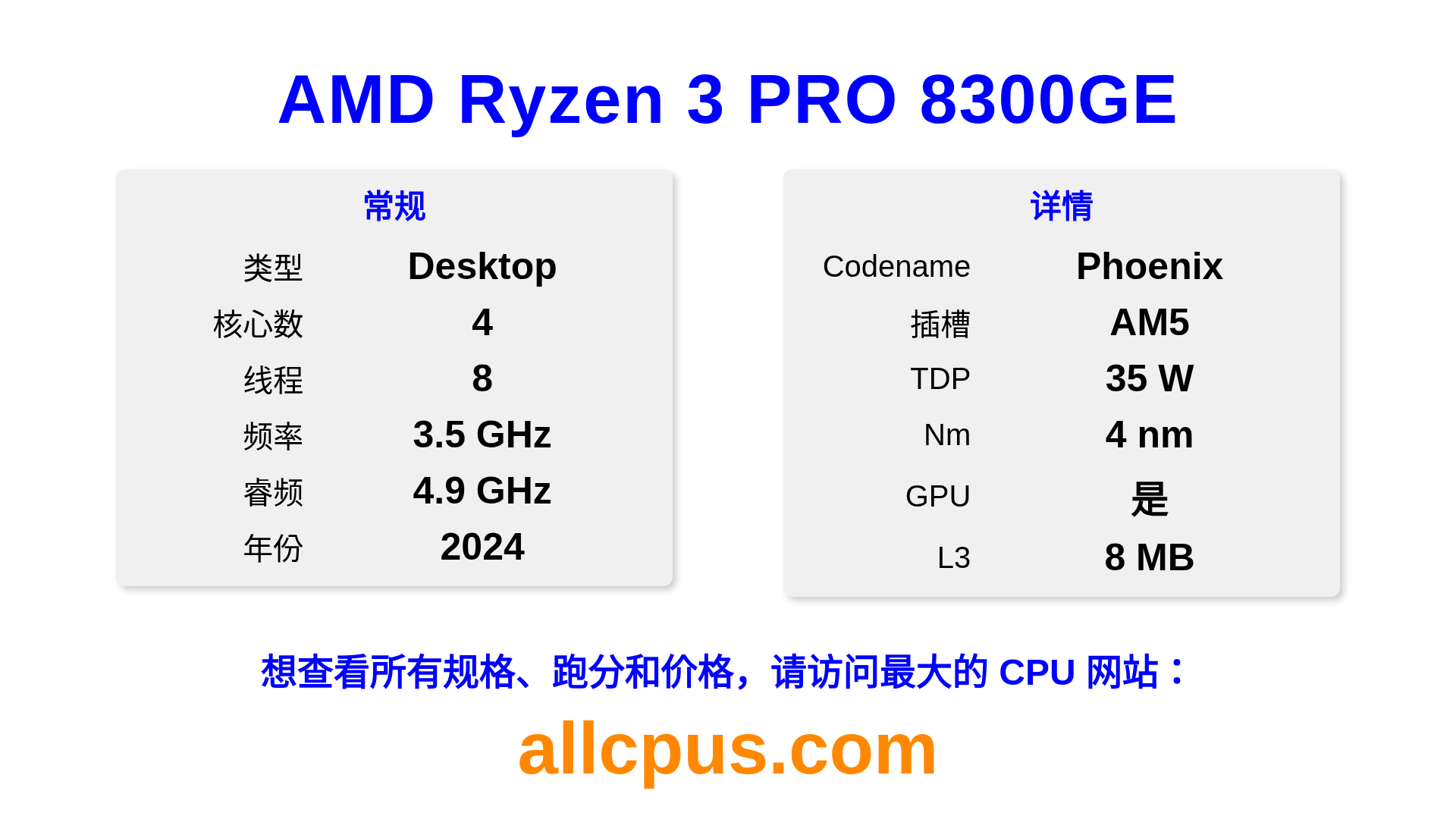 AMD Ryzen 3 PRO 8300GE 是 AMD Ryzen PRO 系列的 桌面处理器,基于 Phoenix 架构,于 2024 发布。 这款 CPU 拥有 4 核心,基础频率为 3500 MHz,最高加速频率为 4900 MHz,L3 缓存为 8 MB。 使用 4 nm 工艺制造。AMD Ryzen 3 PRO 8300GE 设计用于 AM5 插槽。支持超频。 包括集成的 AMD Radeon 740M 显卡。
