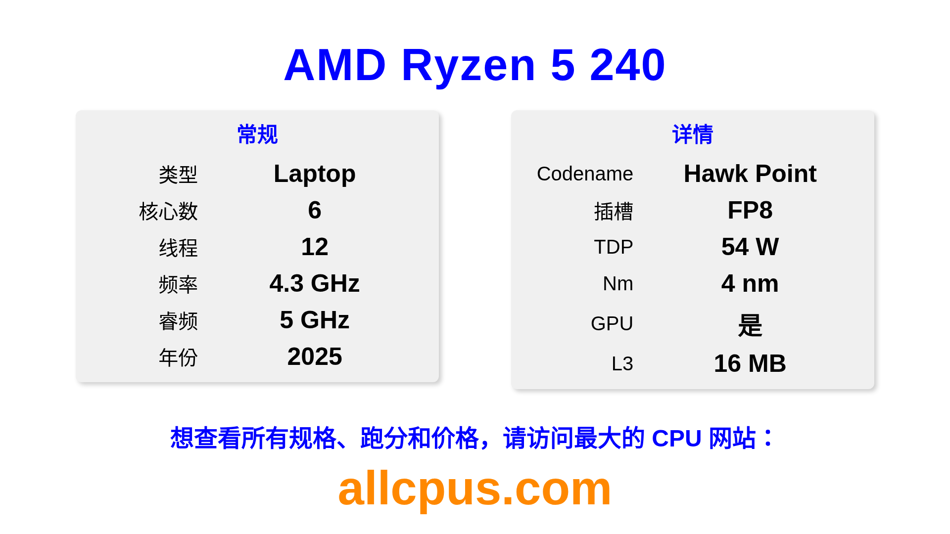 AMD Ryzen 5 240 是 AMD Ryzen 系列的 笔记本处理器,基于 Hawk Point 架构,于 2025 发布。 这款 CPU 拥有 6 核心,基础频率为 4300 MHz,最高加速频率为 5000 MHz,L3 缓存为 16 MB。 使用 4 nm 工艺制造。AMD Ryzen 5 240 设计用于 FP8 插槽。 包括集成的 AMD Radeon 760M 显卡。