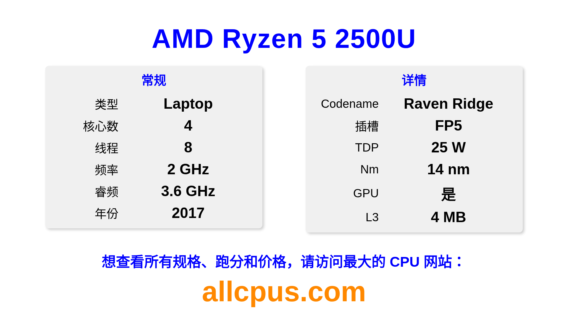 AMD Ryzen 5 2500U 是 AMD Ryzen 系列的 笔记本处理器,基于 Raven Ridge 架构,于 2017 发布。 这款 CPU 拥有 4 核心,基础频率为 2000 MHz,最高加速频率为 3600 MHz,L3 缓存为 4 MB。 使用 14 nm 工艺制造。AMD Ryzen 5 2500U 设计用于 FP5 插槽。 包括集成的 Radeon Vega 8 Graphics 显卡。