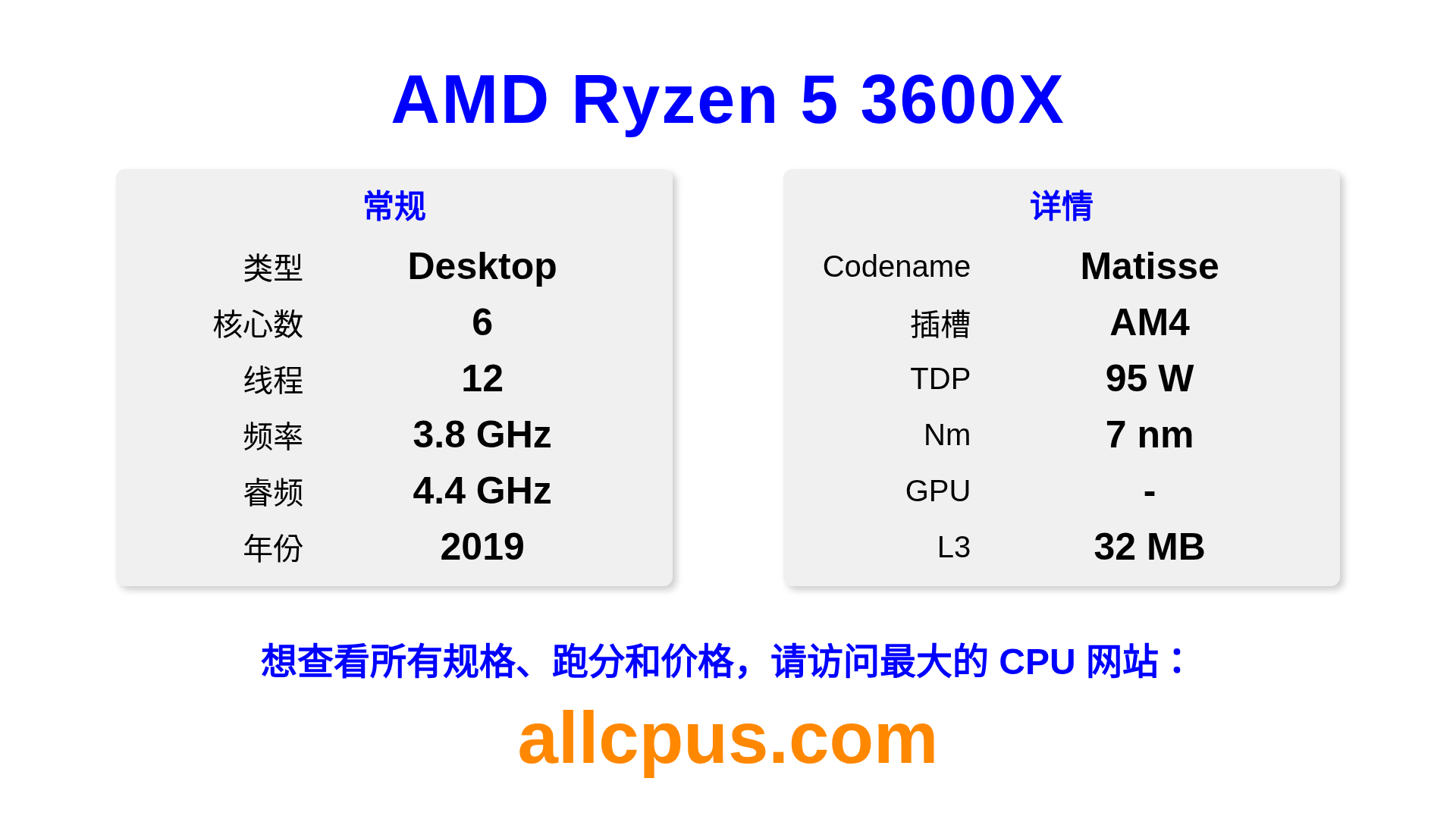 AMD Ryzen 5 3600X 是 AMD Ryzen 系列的 桌面处理器,基于 Matisse 架构,于 2019 发布。 这款 CPU 拥有 6 核心,基础频率为 3800 MHz,最高加速频率为 4400 MHz,L3 缓存为 32 MB。 使用 7 nm 工艺制造。AMD Ryzen 5 3600X 设计用于 AM4 插槽。支持超频。 需要独立显卡。