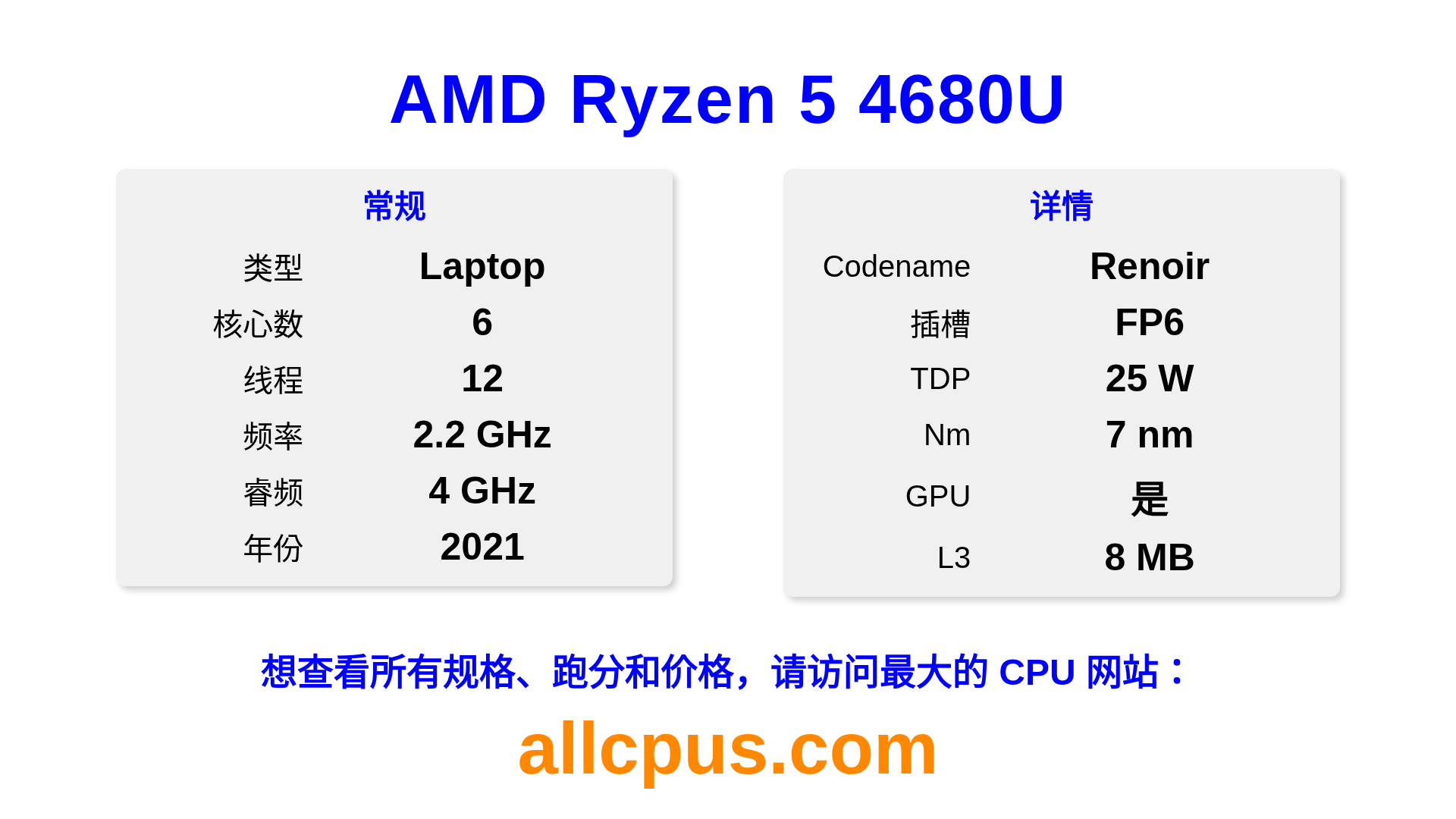 AMD Ryzen 5 4680U 是 AMD Ryzen 系列的 笔记本处理器,基于 Renoir 架构,于 2021 发布。 这款 CPU 拥有 6 核心,基础频率为 2200 MHz,最高加速频率为 4000 MHz,L3 缓存为 8 MB。 使用 7 nm 工艺制造。AMD Ryzen 5 4680U 设计用于 FP6 插槽。 包括集成的 Radeon Graphics 显卡。