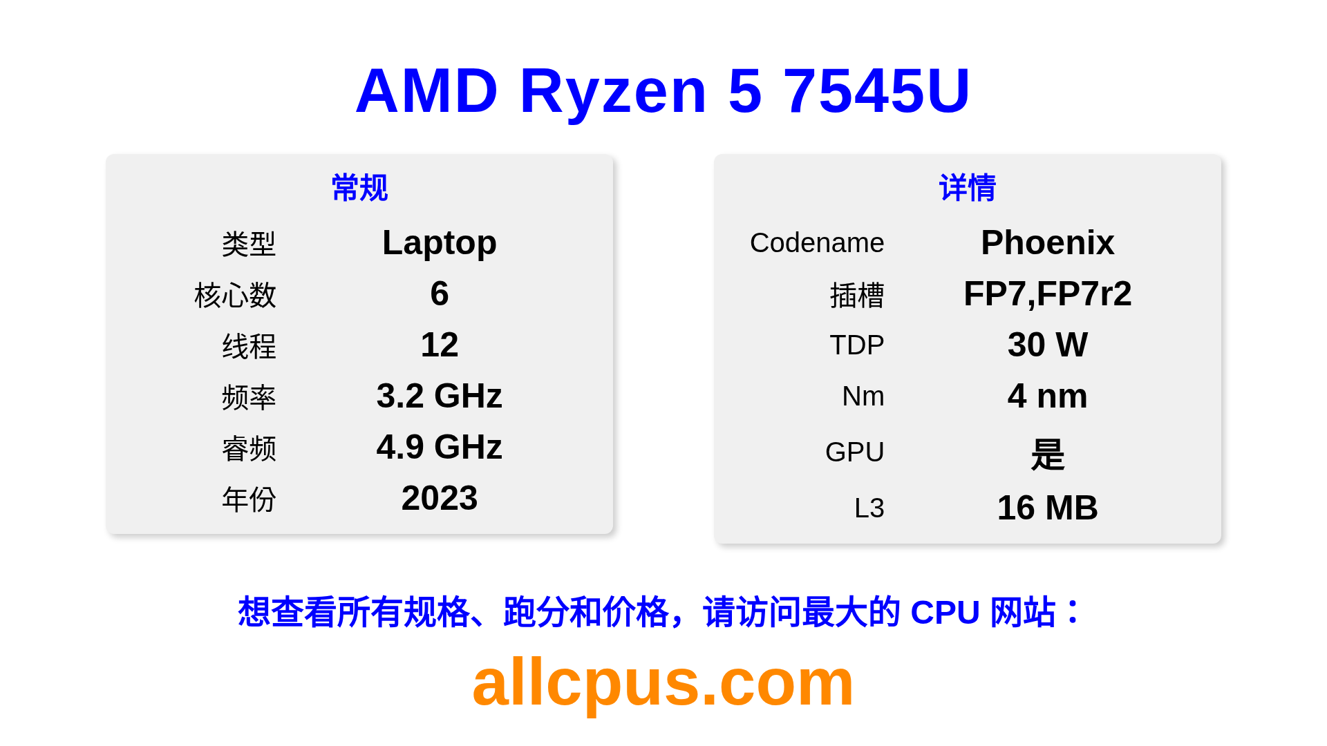 AMD Ryzen 5 7545U 是 AMD Ryzen 系列的 笔记本处理器,基于 Phoenix 架构,于 2023 发布。 这款 CPU 拥有 6 核心,基础频率为 3200 MHz,最高加速频率为 4900 MHz,L3 缓存为 16 MB。 使用 4 nm 工艺制造。AMD Ryzen 5 7545U 设计用于 FP7,FP7r2 插槽。 包括集成的 AMD Radeon 740M 显卡。
