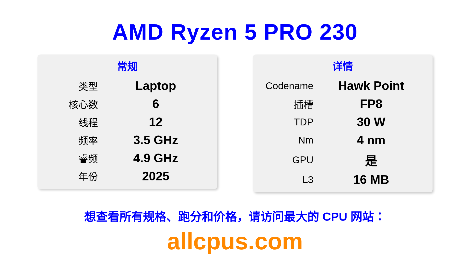AMD Ryzen 5 PRO 230 是 AMD Ryzen PRO 系列的 笔记本处理器,基于 Hawk Point 架构,于 2025 发布。 这款 CPU 拥有 6 核心,基础频率为 3500 MHz,最高加速频率为 4900 MHz,L3 缓存为 16 MB。 使用 4 nm 工艺制造。AMD Ryzen 5 PRO 230 设计用于 FP8 插槽。 包括集成的 AMD Radeon 760M 显卡。