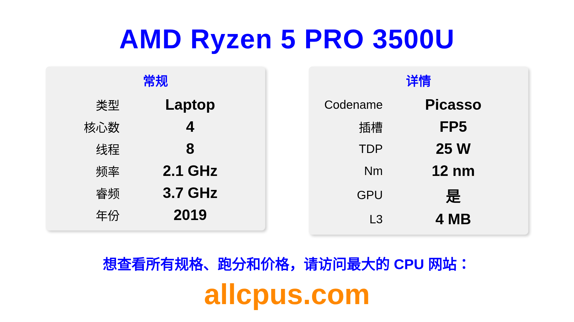 AMD Ryzen 5 PRO 3500U 是 AMD Ryzen PRO 系列的 笔记本处理器,基于 Picasso 架构,于 2019 发布。 这款 CPU 拥有 4 核心,基础频率为 2100 MHz,最高加速频率为 3700 MHz,L3 缓存为 4 MB。 使用 12 nm 工艺制造。AMD Ryzen 5 PRO 3500U 设计用于 FP5 插槽。 包括集成的 Radeon Vega 8 Graphics 显卡。