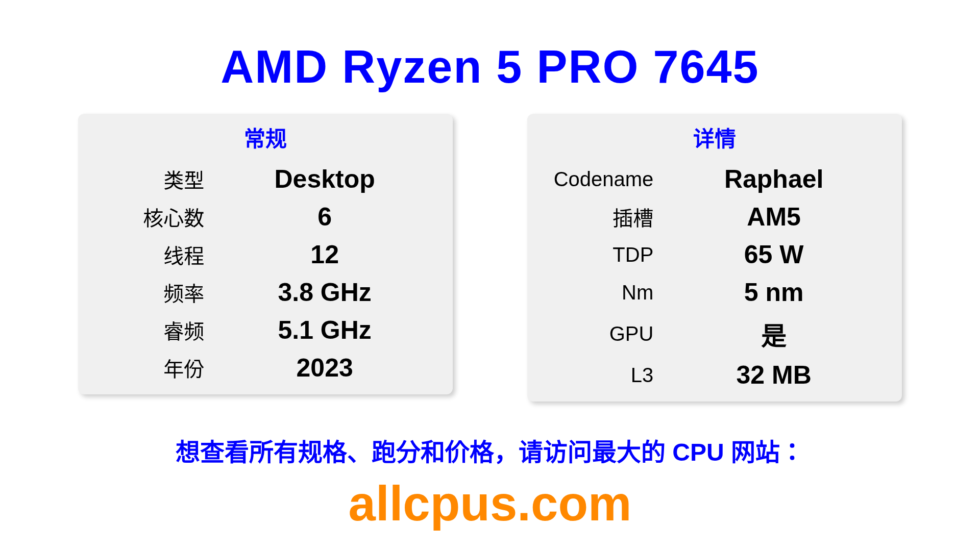AMD Ryzen 5 PRO 7645 是 AMD Ryzen PRO 系列的 桌面处理器,基于 Raphael 架构,于 2023 发布。 这款 CPU 拥有 6 核心,基础频率为 3800 MHz,最高加速频率为 5100 MHz,L3 缓存为 32 MB。 使用 5 nm 工艺制造。AMD Ryzen 5 PRO 7645 设计用于 AM5 插槽。 包括集成的 AMD Radeon Graphics 显卡。