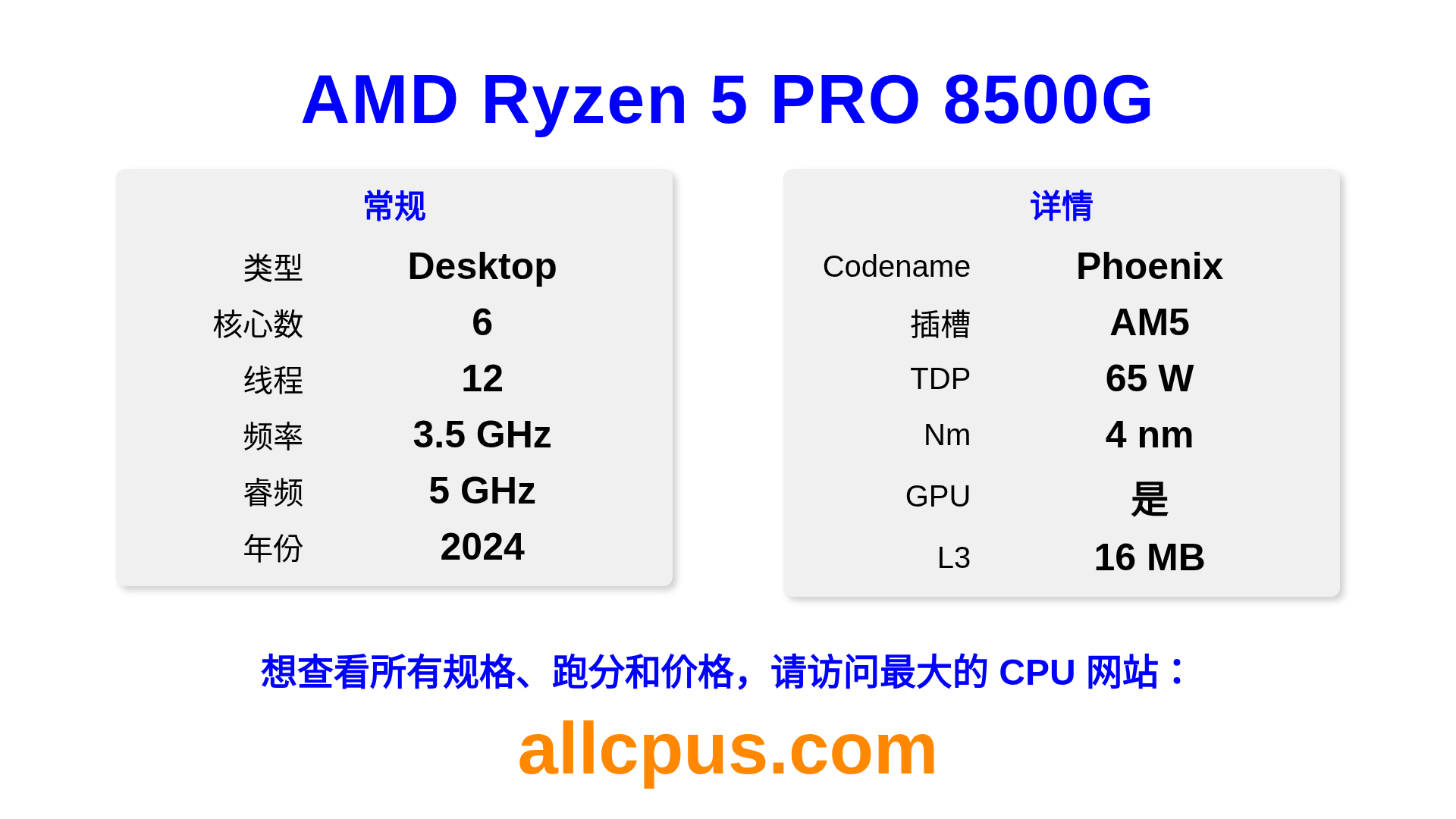 AMD Ryzen 5 PRO 8500G 是 AMD Ryzen PRO 系列的 桌面处理器,基于 Phoenix 架构,于 2024 发布。 这款 CPU 拥有 6 核心,基础频率为 3500 MHz,最高加速频率为 5000 MHz,L3 缓存为 16 MB。 使用 4 nm 工艺制造。AMD Ryzen 5 PRO 8500G 设计用于 AM5 插槽。支持超频。 包括集成的 AMD Radeon 740M 显卡。