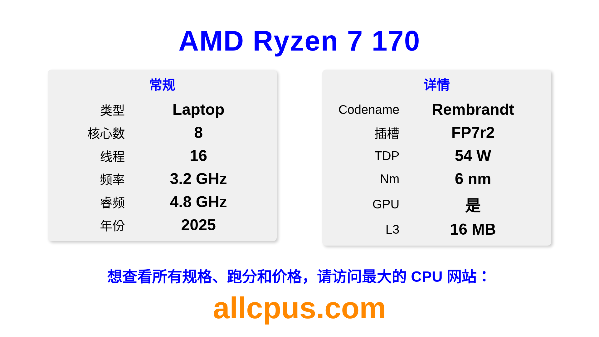 AMD Ryzen 7 170 是 AMD Ryzen 系列的 笔记本处理器,基于 Rembrandt 架构,于 2025 发布。 这款 CPU 拥有 8 核心,基础频率为 3200 MHz,最高加速频率为 4750 MHz,L3 缓存为 16 MB。 使用 6 nm 工艺制造。AMD Ryzen 7 170 设计用于 FP7r2 插槽。 包括集成的 AMD Radeon 680M 显卡。